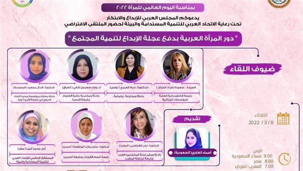 يعقد المجلس العربي للإبداع والابتكار، الملتقى الافتراضي "دور المرأة العربية بدفع عجلة الإبداع لتنمية المجتمع"، وذلك يوم الثلاثاء ٨ مارس، تحت رعاية الاتحاد العربي للتنمية المستدامة والبيئة.