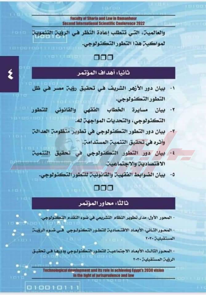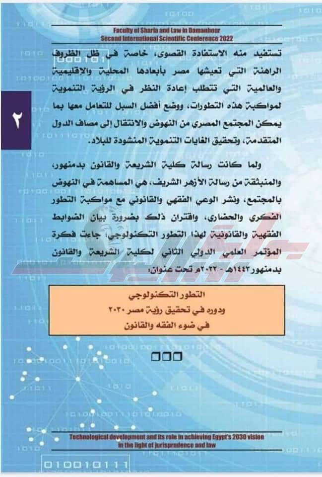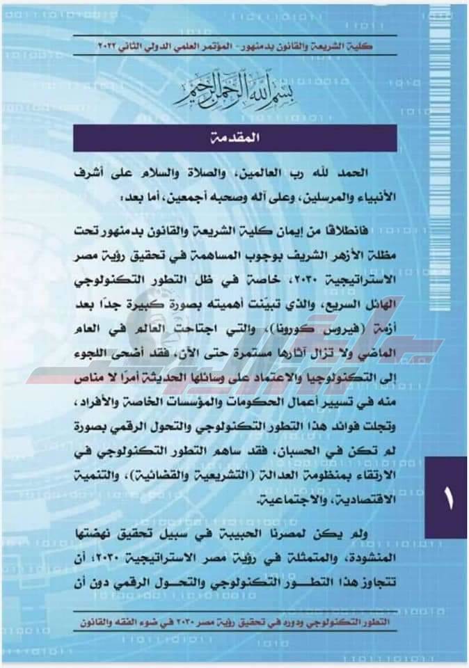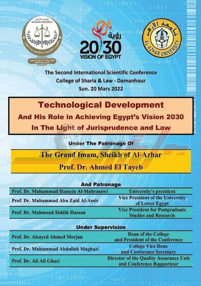 تبدأ كلية الشريعة والقانون بدمنهور تحت رعاية فضيلة الإمام الأكبر الدكتور أحمد الطيب شيخ الأزهر وفضيلة الدكتور محمد المحرصاوى رئيس الجامعة والدكتور محمد أبوزيد الأمير نائب رئيس الجامعة للوجه البحري والدكتور محمود صديق نائب رئيس الجامعة للدراسات العليا والبحوث، و إشراف الدكتور السيد احمد مرجان عميد الكلية، مؤتمرها العلمى الدولى الثانى ٢٠٢٢ تحت عنوان "التطور التكنولوجي ودورة فى تحقيق رؤية مصر ٢٠٣٠ فى ضوء الفقه والقانون”.