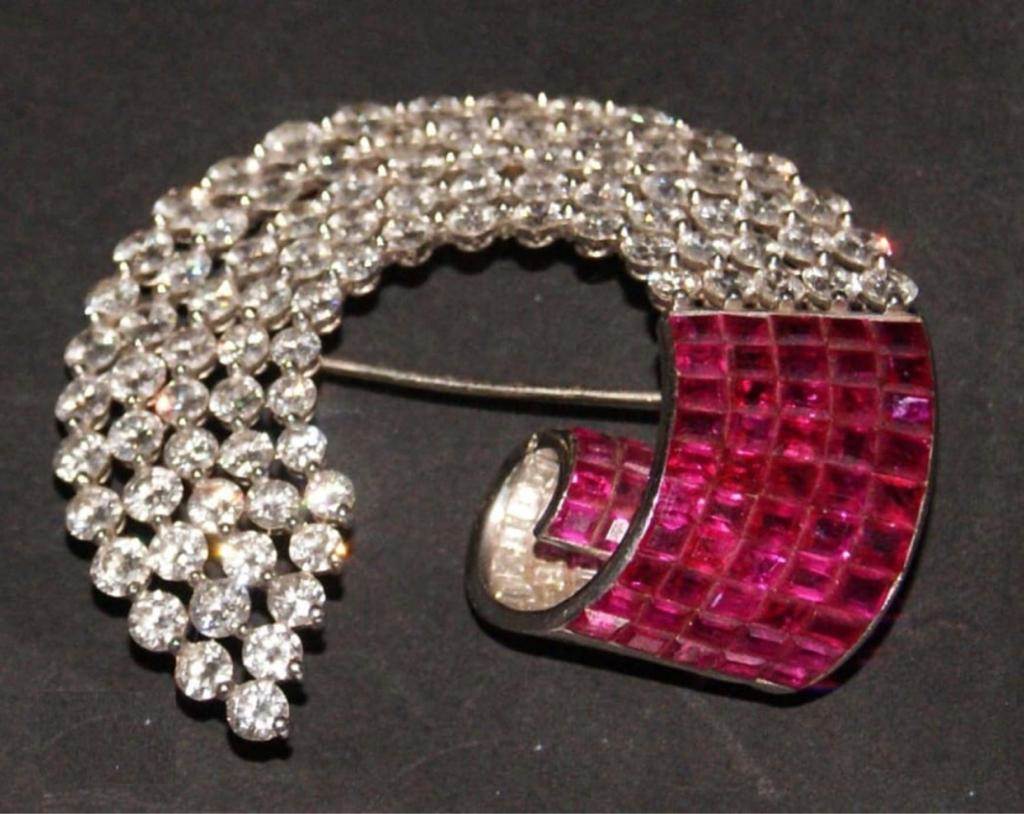 متحف المجوهرات الملكية: يعرض بروش من البلاتين بشكل حرف C، ويحتوي على أحجار من الماس البرلنتي والباجيت والياقوت الأحمر.