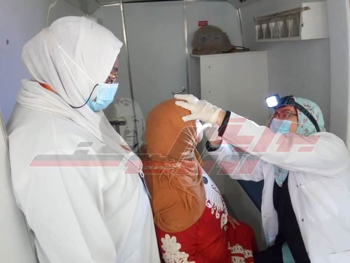 كما ضمت القافلة تطعيم ضد فيروس كورونا وفريق لصحة المرأة لفحص الثدى والأمراض المزمنة وقياس الضغط والسكر.