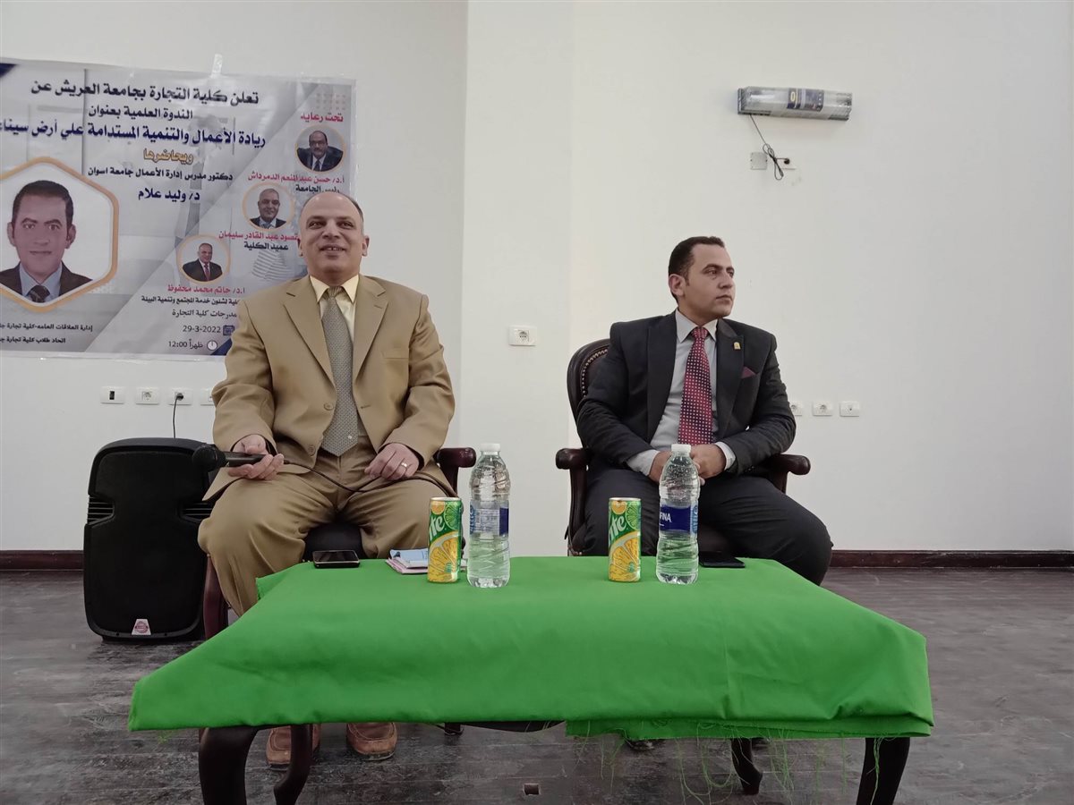 نظمت كلية التجارة بجامعة العريش ( اليوم ) ندوة ضمن نشاط وكالة خدمة المجتمع وتنمية البيئة بعنوان: "ريادة الأعمال والتنمية المستدامة على أرض سيناء".. حاضر فيها الدكتور وليد علام رئيس قسم إدارة الأعمال بجامعة أسوان.