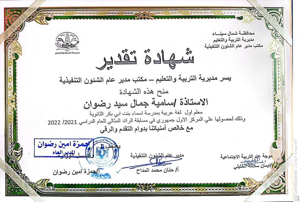 حصلت معلمة من شمال سيناء على لقب الرائد المثالي على مستوى الجمهورية للمرحلة الثانوية، حيث حصلت سامية جمال سيد رضوان من مدرسة أسماء بنت أبي بكر الثالنوية بالعريش على الرائد المثالي على مستوى الجمهورية للمرحلة الثانوية .