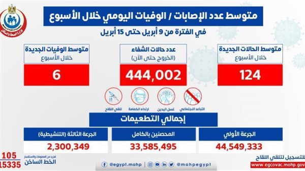 يذكر أن عدد الحاصلين على اللقاحات المضادة لفيروس كورونا بلغ 33 مليونًا و 585 ألفًا و495 من المحصنين بالكامل حتى الآن، وتناشد الوزارة، المواطنين بالتسجيل على الموقع الإلكتروني للوزارة https://egcovac.mohp.gov.eg/#/registration لتلقي لقاحات فيروس كورونا، والتي تساهم في حماية كافة أفراد الأسرة من الإصابات الشديدة بفيروس كورونا ومتحوراته، مؤكدة أن الدولة المصرية لا تدخر جهدًا في توفير اللقاحات للمواطنين بالمجان، وذلك في إطار حرص الوزارة على الصحة العامة للمواطنين وعلى مكتسبات الدولة في التصدي للجائحة.