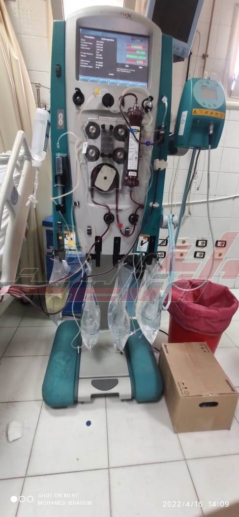 و تم تشغيل ماكينة الغسيل الدموي بريزما لمريض يبلغ من العمر ٦٥عاما بحضور الدكتور رضا بكر مدير المستشفى والدكتور أحمد الكومى مدير وحده الكلى بالمستشفى والدكتور محمد عبدالحفيظ طبيب الكلى.