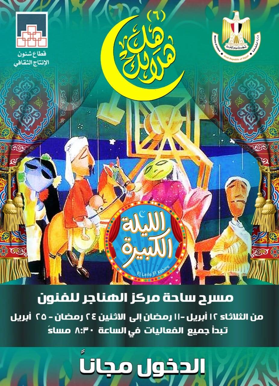ضمن خطة وزارة الثقافة، وتحت رعاية الفنانة الدكتورة إيناس عبد الدايم وزيرة الثقافة، وبرئاسة المخرج خالد جلال رئيس قطاع شؤون الإنتاج الثقافى، تنطلق فعاليات الليلة الثامنة من النسخة السادسة لبرنامج هل هلالك، الذي يقدمه القطاع مجانا يوميا للجمهور، فى الثامنة والنصف من مساء غدا الاثنين، على مسرح ساحة مركز الهناجر للفنون، وتستمر ليالى البرنامج حتى ٢٤ رمضان.