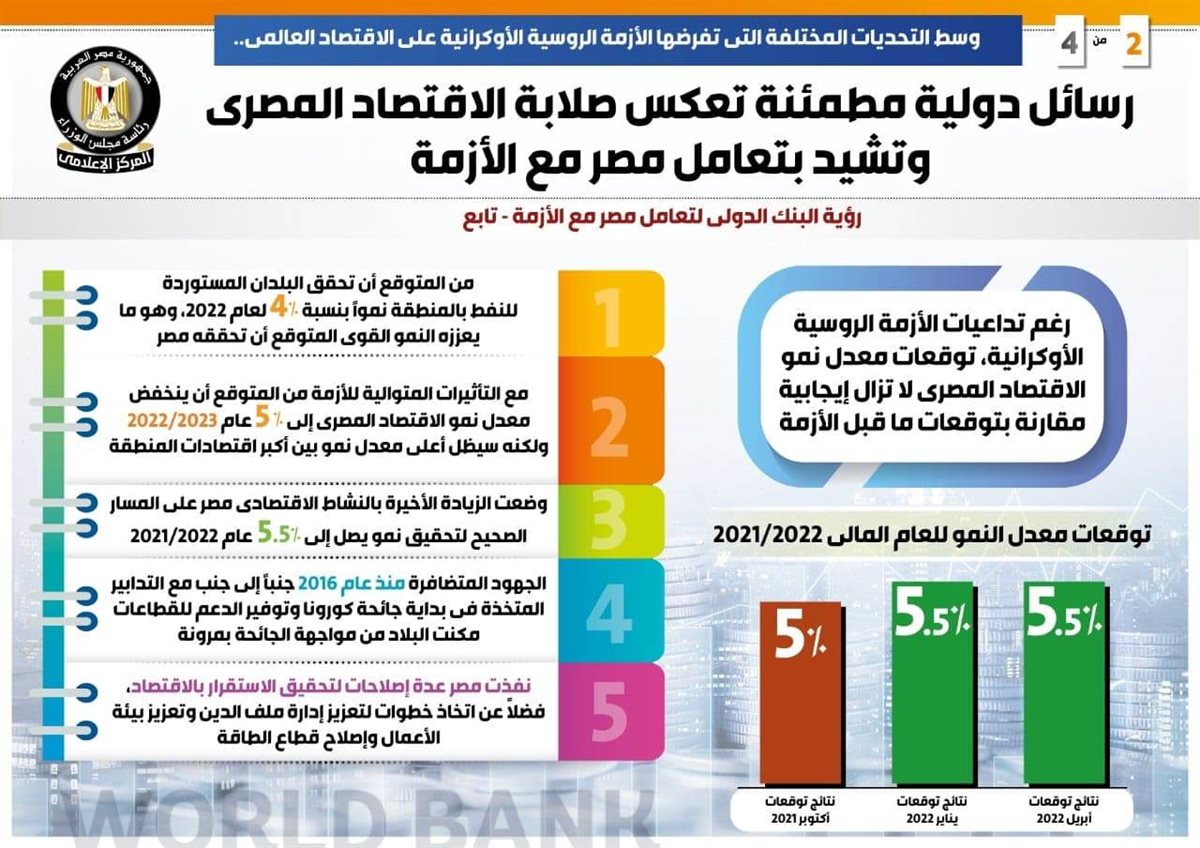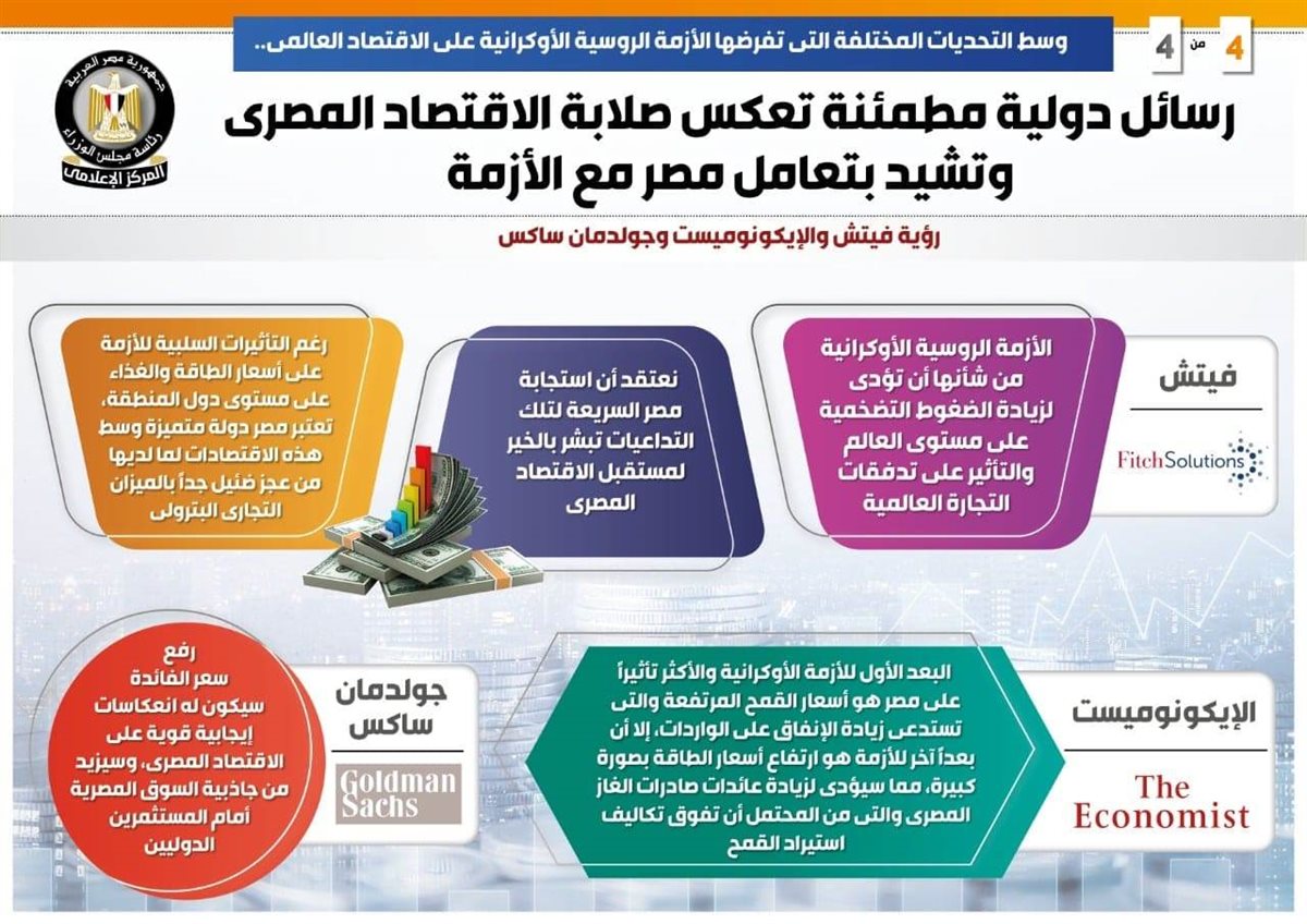 وفي هذا الصدد نشر المركز الإعلامي لمجلس الوزراء تقريرًا تضمن إنفوجرافات تسلط الضوء على الرسائل الدولية المطمئنة التي تعكس صلابة الاقتصاد المصري وتشيد بتعامل مصر مع التحديات المختلفة التي تفرضها الأزمة الروسية الأوكرانية على الاقتصاد العالمي.