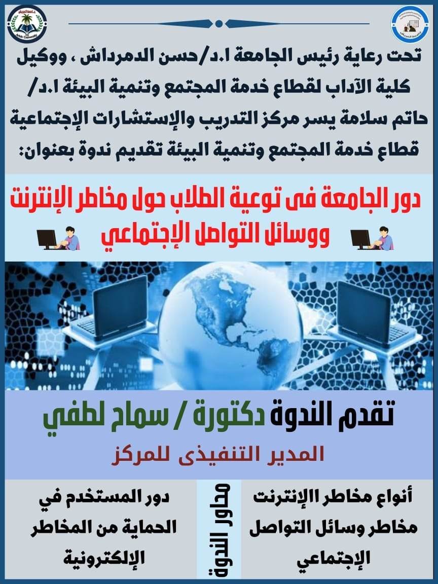 ومن جهة أخرى.. قام قطاع خدمة المجتمع وتنمية البيئة بكلية الآداب بالتعاون مع مركز التدريب والاستشارات الاجتماعية بتنفيذ ندوة تثقيفية بعنوان: "دور جامعة العريش في توعية الطلاب حول مخاطر الأنترنت ووسائل التواصل الاجتماعى"، ونفذتها الدكتورة سماح لطفى المدير التنفيذي لمركز التدريب والاستشارات الاجتماعية عبر منصة: Microsoft Teams ، وشملت الندوة ثلاث محاور رئيسية: طبيعة وأنواع مخاطر الأنترنت ، مخاطر وسائل التواصل الاجتماعى، ودور الجامعة فى حماية المستخدم من المخاطر الإلكترونية.