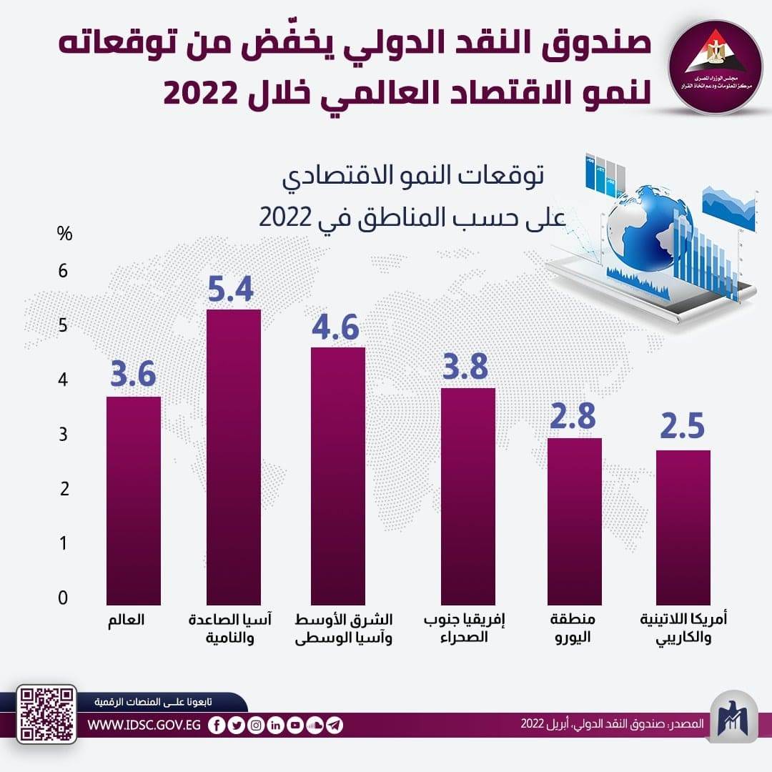 - نشر مركز المعلومات ودعم اتخاذ القرار إنفو جرافيك جديدًا يتناول التوقعات الجديدة لصندوق النقد الدولي لنمو الاقتصاد العالمي، وقد توقع الصندوق أن ينمو الاقتصاد المصري بمعدل 5.9% خلال 2022 وذلك مقارنة بنحو 3.3% خلال 2021.