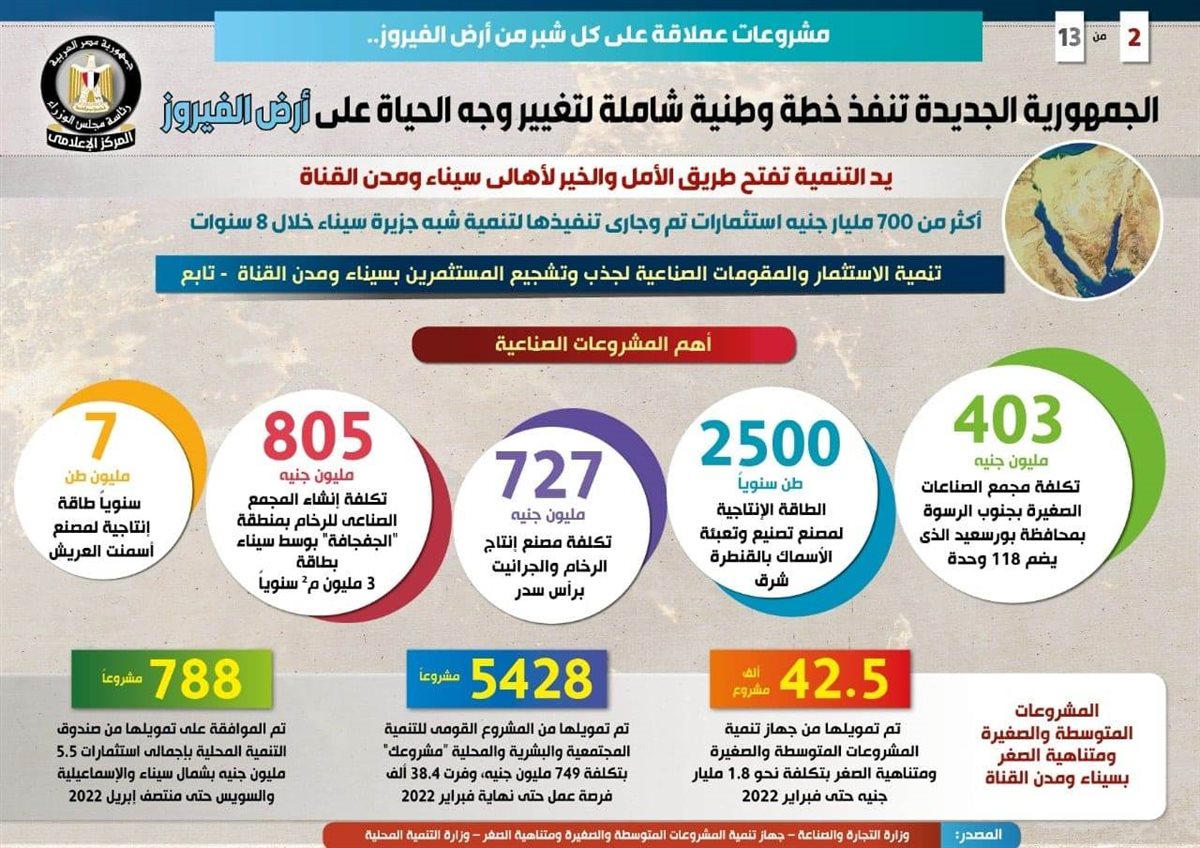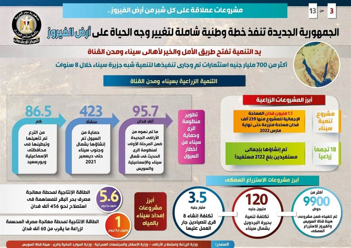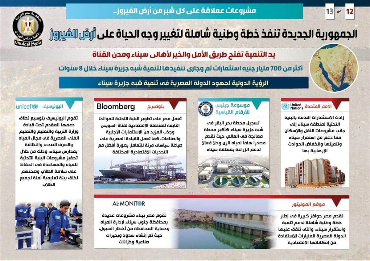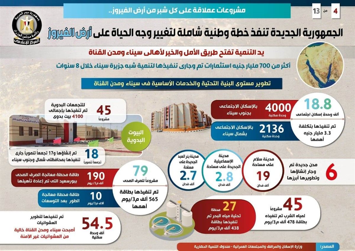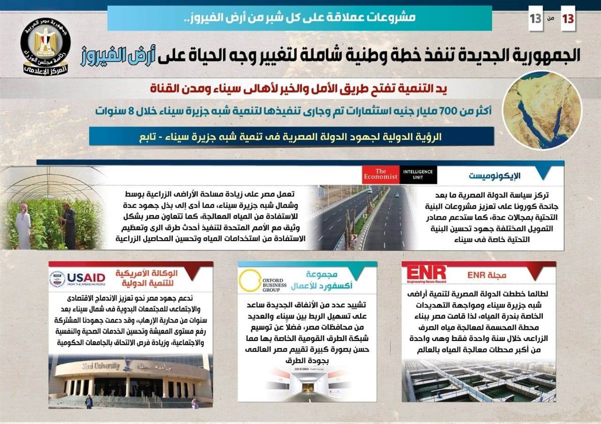 وفي هذا الصدد، نشر المركز الإعلامي لمجلس الوزراء تقريراً تضمن إنفوجرافات تسلط الضوء على الخطة الوطنية والشاملة للجمهورية الجديدة من أجل تغيير وجه الحياة على أرض الفيروز من خلال إطلاق مشروعات عملاقة على كل شبر منها، باستثمارات تبلغ أكثر من 700 مليار جنيه تم وجار تنفيذها لتنمية سيناء خلال 8 سنوات.