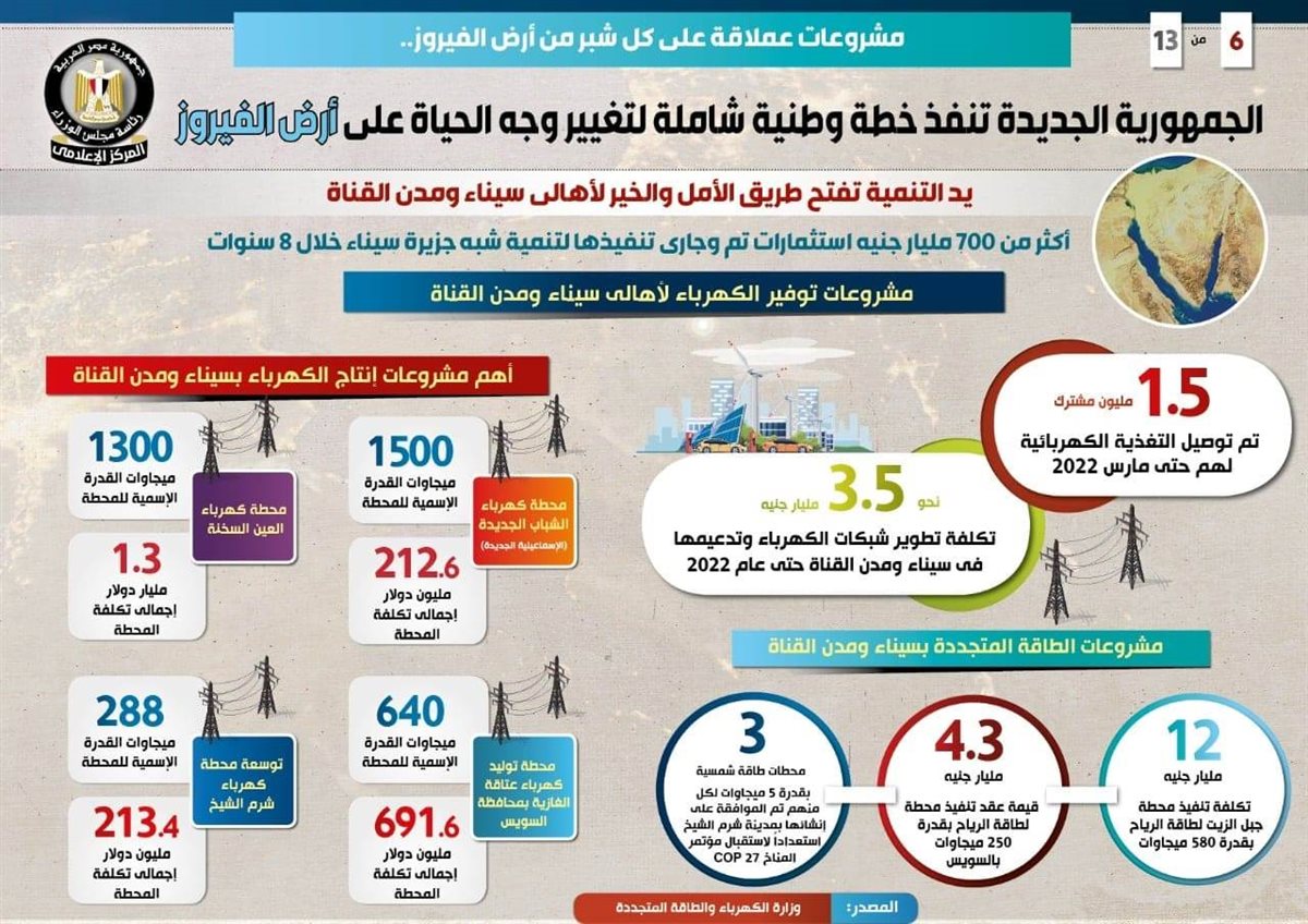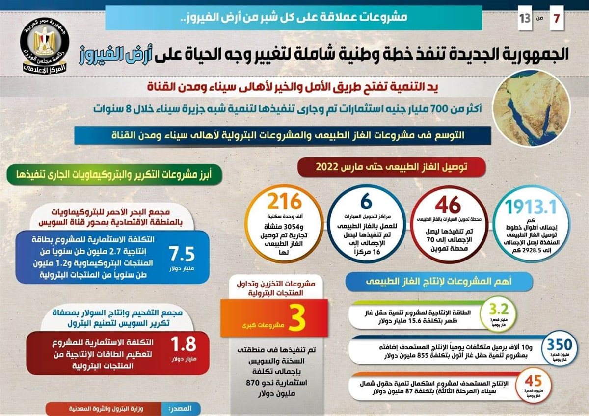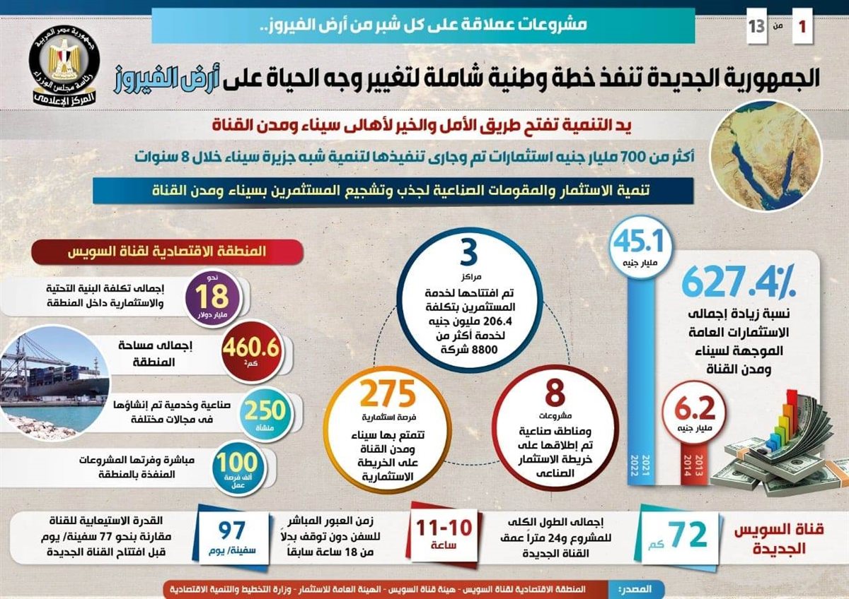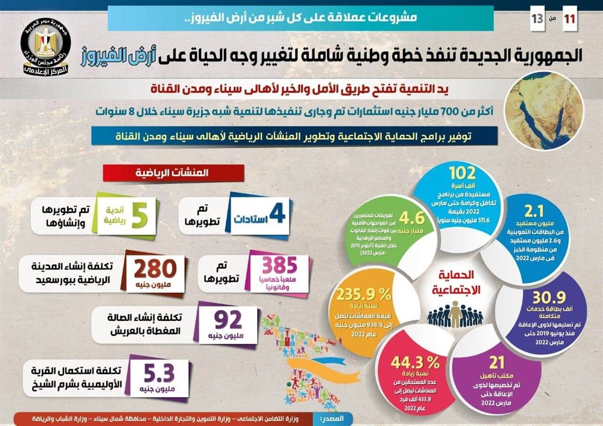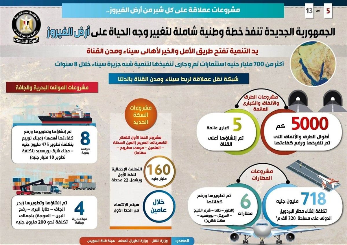 وفي هذا الصدد، نشر المركز الإعلامي لمجلس الوزراء تقريراً تضمن إنفوجرافات تسلط الضوء على الخطة الوطنية والشاملة للجمهورية الجديدة من أجل تغيير وجه الحياة على أرض الفيروز من خلال إطلاق مشروعات عملاقة على كل شبر منها، باستثمارات تبلغ أكثر من 700 مليار جنيه تم وجار تنفيذها لتنمية سيناء خلال 8 سنوات.