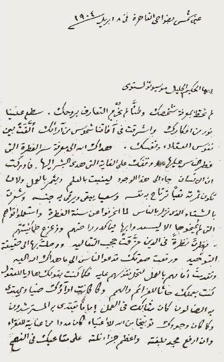 وختامًا لمقالنا السريع هذا رأينا أن نثبت نص الرسالة الوحيدة التي بعث بها الإمام المجدد محمـد عبده إلى الفيلسوف تولستوي.. الذي جهر بالحق وسط اللغط والتلفيقات والأكاذيب الشرسة ضد الإسلام ونبي الإسلام، لكن الموت حال بين تواصل الرسائل والحوار، ولد الإمام سنة 1849 م وانتقل إلى جوار ربه في سنة 1905 بعد إرسال رسالته بعدة أشهر عن طريق البريد، وكان الوسيلة المتاحة في هذا الزمان.. والرسالة مثبته في كتاب " حِكم النبي محمـد".. قال الإمام في رسالته: "أيها الحكيم الجليل موسيو تولستوي: لن نحظ بمعرفة شخصك ولكننا لم نحرم من التعارف مع روحك، سطع علينا نور من أفكارك، وأشرقت في آفاقناشموس من آرائك، ألفت بين نفوس العقلاء ونفسك، هداك اللـه إلى معرفة سر الفطرة التي فطر الناس عليها ووقفك على الغاية التي هدى البشر إليها، فأدركت أن الإنسان جاء إلى هذا الوجود لينبت بالعلم ويثمر بالعمل ولأن تكون ثمرته تعبًا ترتاح به نفسك وسعيًا يبقى به، ويربي جنسه، وشعرت بالشقاء الذي نزل بالناس لما انحرفوا عن سُنة الفطرة وبما استعملوا قواهم التي لم يُمنحوها إلا ليسعدوا بها فيما كدر راحتهم وزعزع طمأنينتهم. ونظرت نظرة في الدين مزقت حجب التقاليد، ووصلت بها إلى حقيقة التوحيد ورفعت صوتك تدعو الناس إلى ماهداك اللـه إليه، وتقدمت أمامهم بالعمل لتحمل نفوسهم عليه فكما كنت بقولك هاديًا للعقول، كنت بعملك حاثًا للعزائم والهمم، وكما كانت آراؤك ضياء يهتدى بها الضالون كان مثالك في العمل إمامًا يقتدي به المسترشدون، وكما كان وجودك توبيخًا من اللـه للأغنياء كان مدادًا من عنايته للضعفاء والفقراء، وإن أرفع مجد بلغته وأكبر جزاء نلته على متاعبك في النصح والإرشاد هو هذا الذي سماه الغافلون بالحرمان والإبعاد، فبيس ما حصل لك من رؤساء الدين سوى اعتراف منهم أعلنوه للناس أنك لست من القوم الضالين فاحمد اللـه على أن فارقوك في أقوالهم كما كنت فارقتهم في عقائدهم وأعمالهم. هذا وأن نفوسنا لشيقة إلى ما يتجدد من آثار قلمك فيما تستقبل من أيام عمرك وإنا نسأل اللـه أن يمد في حياتك ويحفظ عليك قواك ويفتح أبواب القلوب لفهم قولك ويسوق النفوس إلى التأسي بك في عملك والسلام.