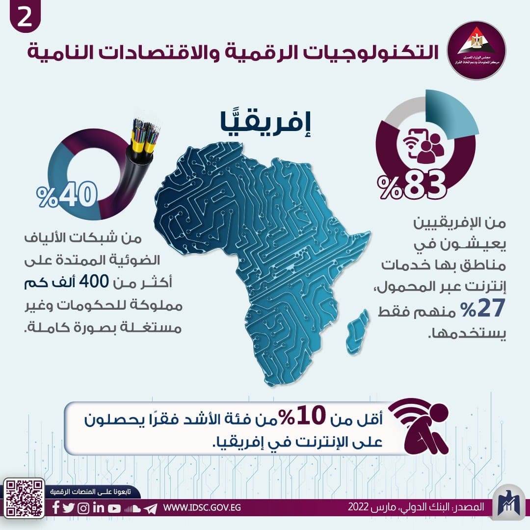 وأشار المركز إلى أنه في نطاق إفريقيا فإن 27% من السكان لا يستخدمون خدمات الإنترنت المحمول رغم توافرها لنحو 83% منهم، كما أن 40% من شبكات الألياف الضوئية الممتدة على أكثر من 400 ألف كم مملوكة للحكومات وغير مستغلة بصورة كاملة.