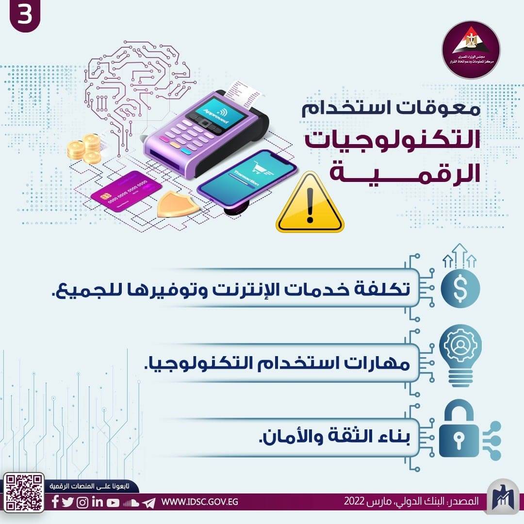 أظهر مركز المعلومات ودعم اتخاذ القرار بمجلس الوزراء أنه رغم ارتفاع عدد مستخدمي التكنولوجيا الرقمية إلى 5 مليارات مستخدم عالميًّا، فإنه لا يزال 3 ملايين مستخدم غير متصلين بشبكة الإنترنت، ويعيش 96% منهم في الدول النامية، مشيرا إلى زيادة نحو 39% في عدد المستفيدين في الدول التي تطبق نظام المدفوعات الحكومية.