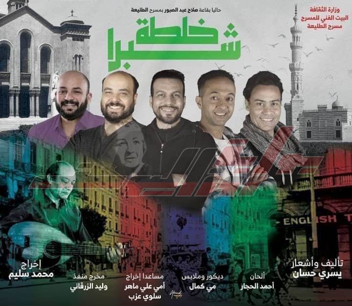 وتستمر فرقة مسرح الطليعة في تقديم "خلطة شبرا" ابتداء من ثاني أيام عيد الفطر المبارك في تمام السابعة مساء بقاعة صلاح عبد الصبور بمسرح الطليعة بالعتبة بطولة علاء النقيب، أحمد عبد الجواد، محمد هاني محمود عبد الرازق، الحان الراحل أحمد الحجار، غناء ماهر محمود، ديكور وملابس مي كمال، مادة فيلمية عبد الحميد السيد، تأليف و أشعار يسري حسان ، وإخراج محمد سليم.