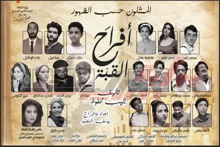 وتعود فرقة مسرح الشباب لتقدم "أفراح القبة" و ذلك على المسرح العائم الصغير بالمنيل في السابعة مساء، عن رواية الكاتب نجيب محفوظ، كتابة وإخراج محمد يوسف المنصور، بطولة محمد يسري، سمر علام، فاطمة عادل، حمزة رأفت، مينا نبيل، أحمد صلاح، عبدالمنعم رياض، محمد عبد القادر، جيهان أنور، مينا نادر، جورج أشرف، هايدى عبدالخالق، وفاء عبد الله ، باسم سليمان، مارتينا روؤف، هدير طارق، ديكور وتصميم اضاءة عمرو الأشرف، تصميم ازياء عبير بدراوي، تأليف موسيقي أحمد نبيل، تصميم حركى مناضل عنتر، كتابة وإخراج محمد يوسف المنصور.