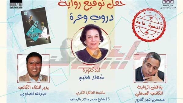 تقيم مكتبة القاهرة الكبرى العامة، التابعة لقطاع شؤون الانتاج الثقافي بوزارة الثقافة، حفل توقيع ومناقشىة رواية "دروب وعرة" للروائية الدكتورة سُعاد فطيم، وذلك في تمام الساعة السابعة مساء يوم الأربعاء 18 مايو المقبل، بمقر المكتبة بالزمالك.