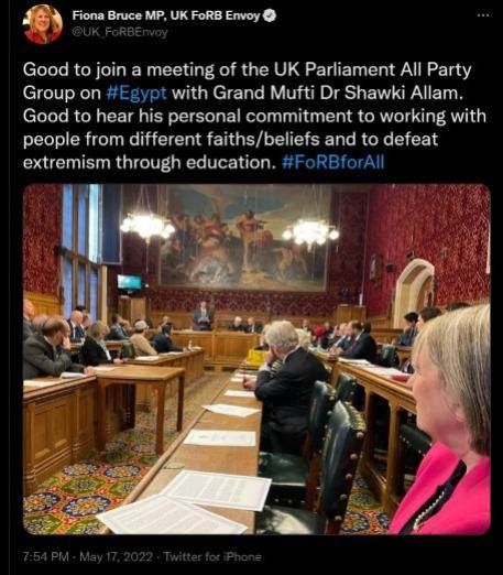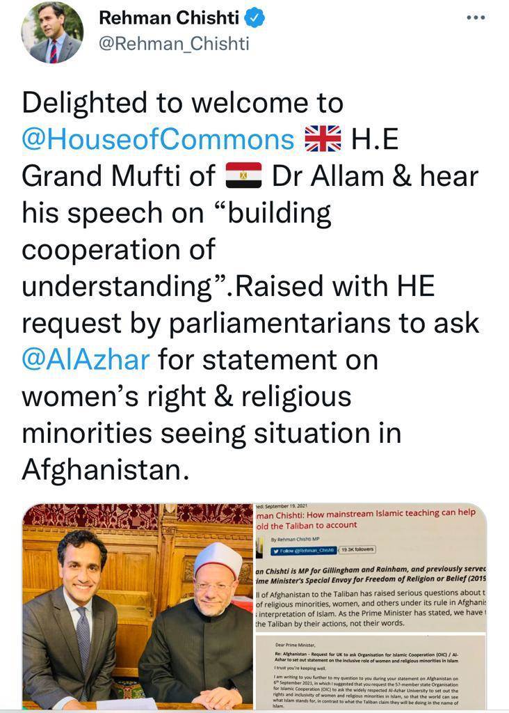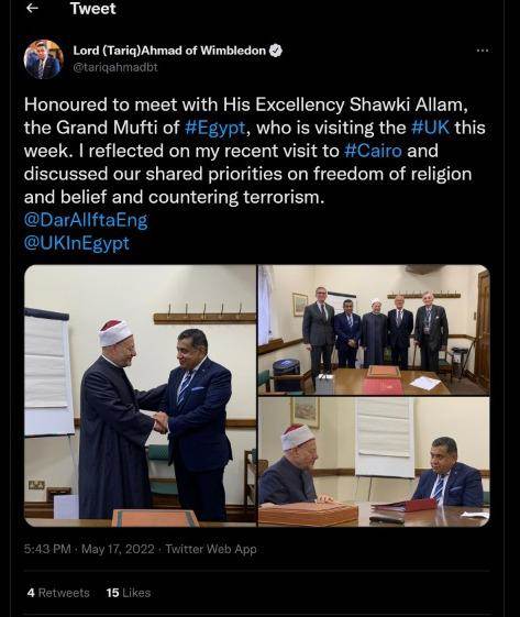 كما غرد اللورد طارق أحمد وزير الدولة بالخارجية البريطانية: "تشرفنا بلقاء الدكتور شوقي علام، مفتي مصر، الذي يزور المملكة المتحدة هذا الأسبوع واستقباله داخل مجلس العموم البريطاني. لقد التقيته في زيارتي الأخيرة إلى القاهرة وناقشت أولوياتنا المشتركة بشأن حرية الدين والمعتقد ومكافحة الإرهاب".