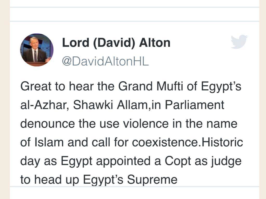 فيما غرد اللورد ديفيد ألتون السياسي البريطاني العضو المستقل في لجنة العلاقات الدولية والدفاع في مجلس اللوردات: "من الرائع سماع مفتي مصر شوقي علام في البرلمان يندد باستخدام العنف باسم الإسلام ويدعو إلى التعايش".