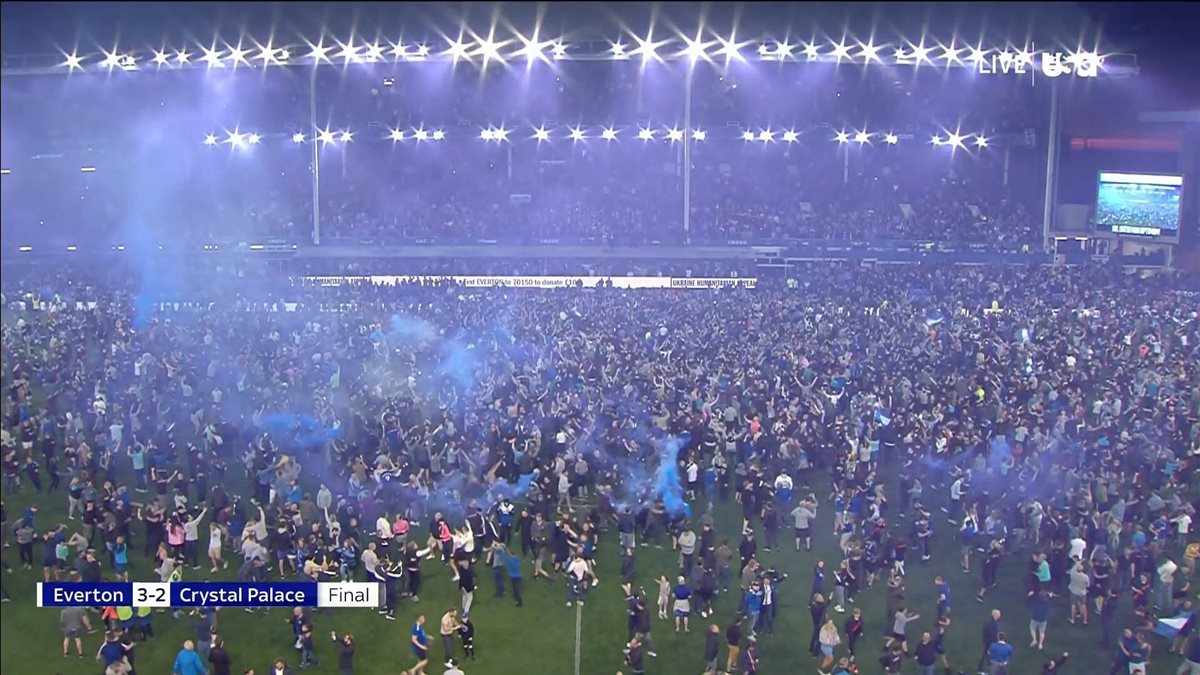 ونزلت جماهير إيفرتون أرض الملعب بعد تسجيل الهدف الثالث والفوز، وخرجت سريعًا بعد الفرحة الهستيرية التي شهدها ملعب المباراة، ونزلت الجماهير مرة أخرى بعد انتهاء اللقاء.