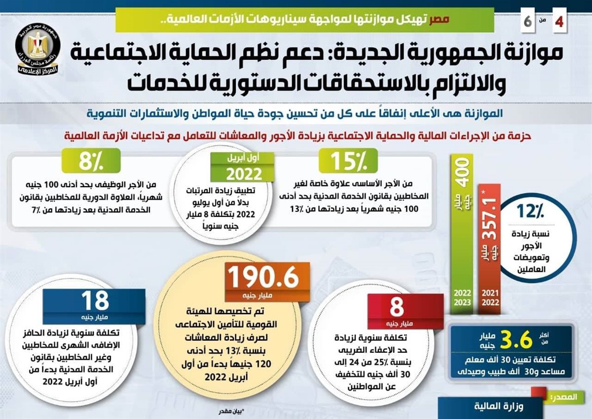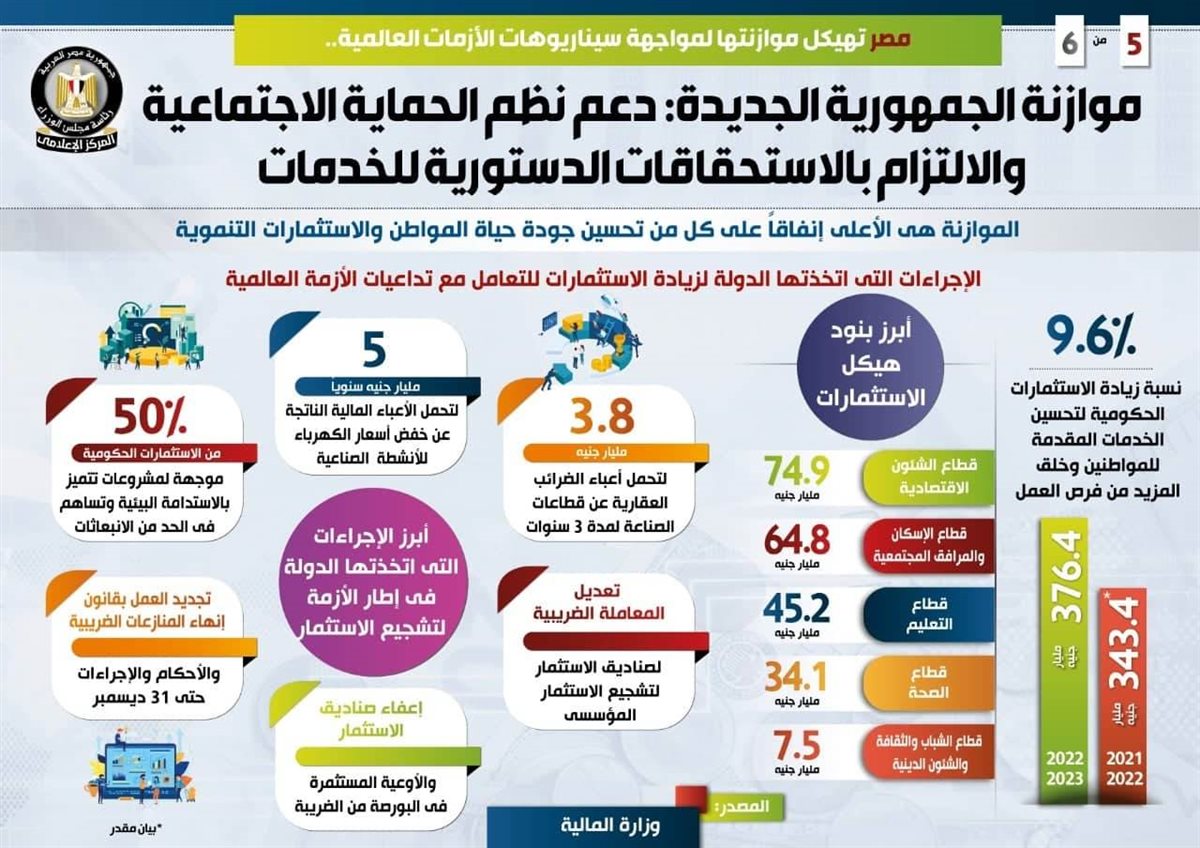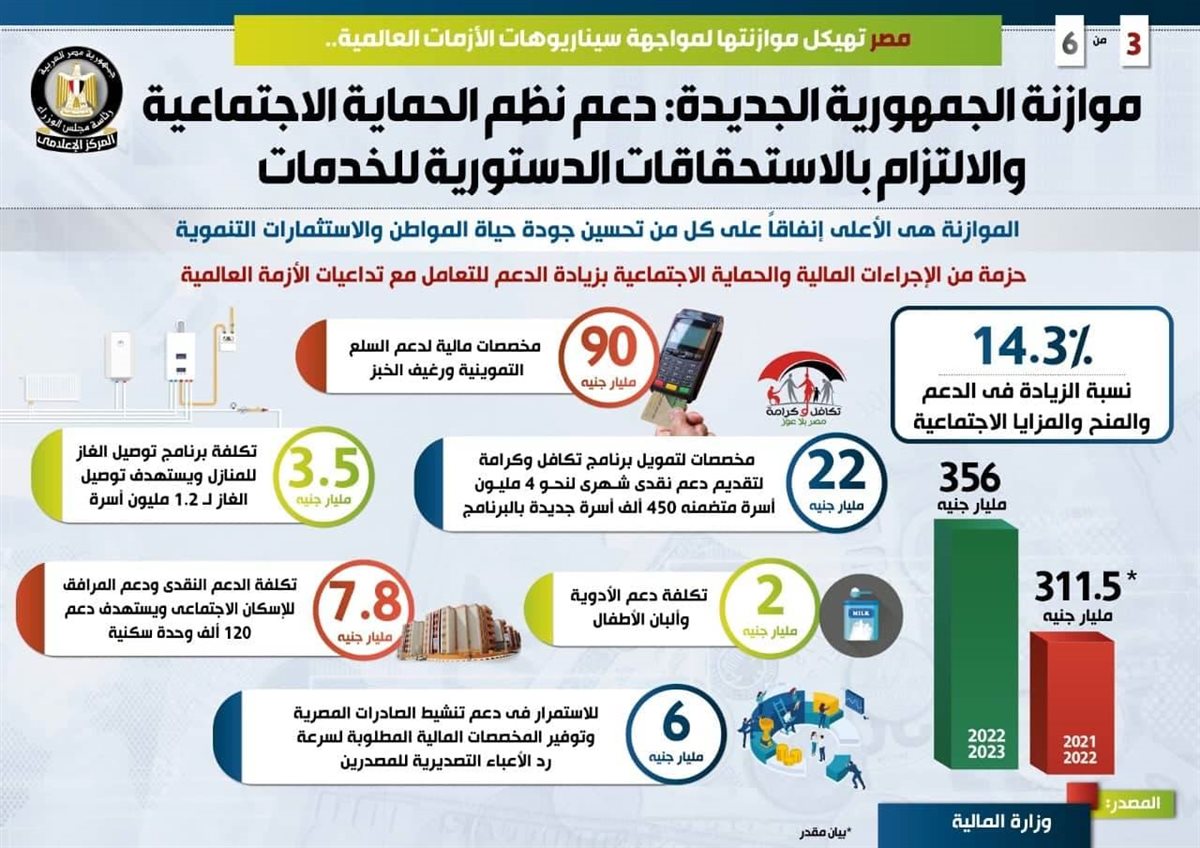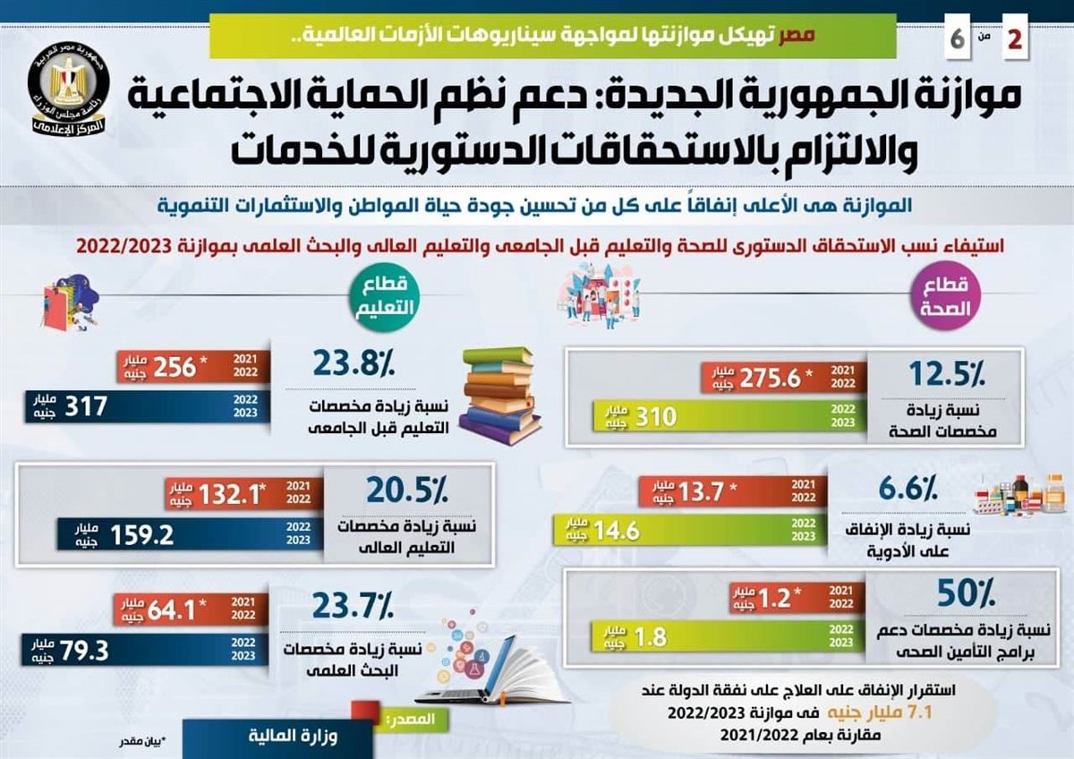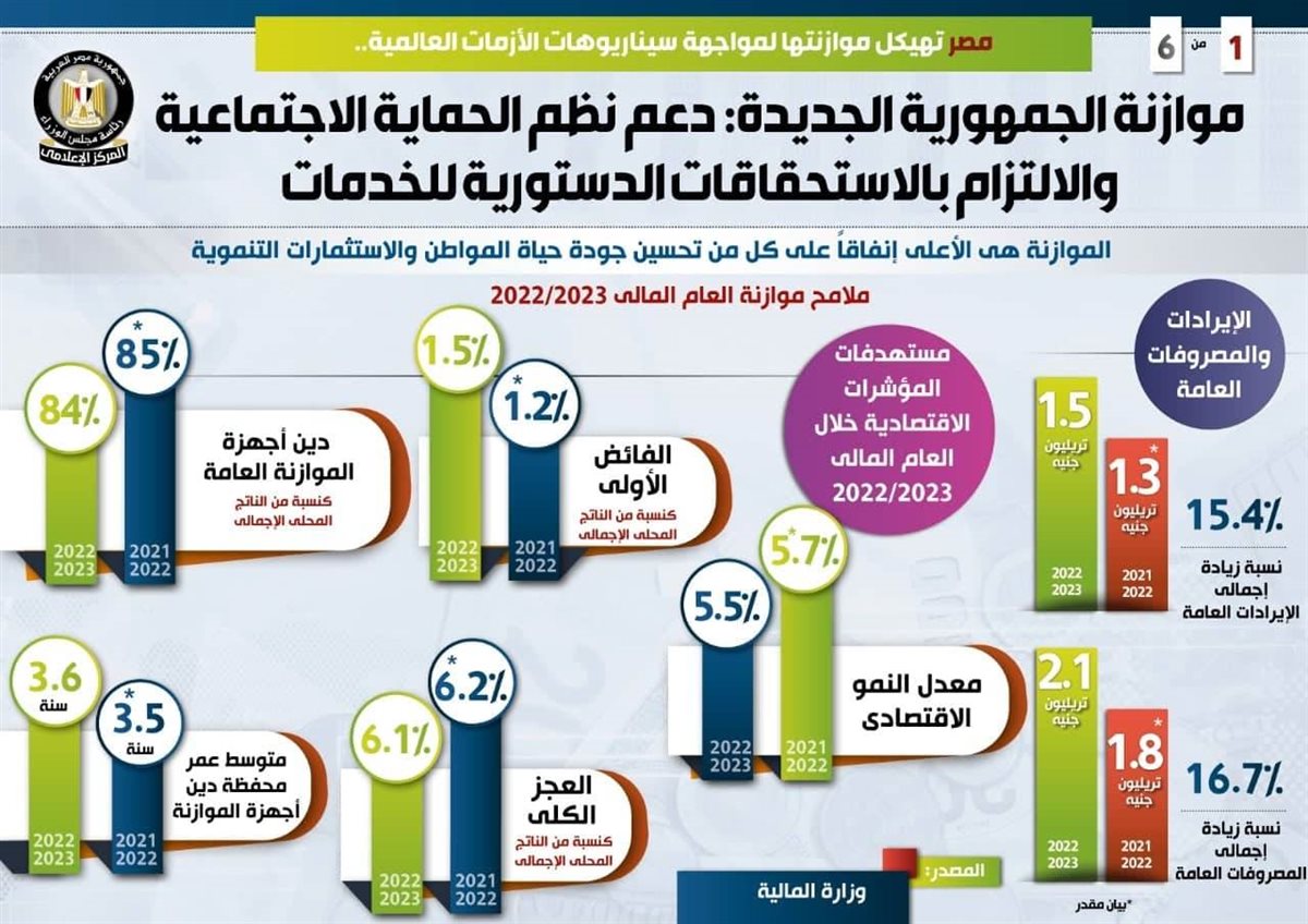 وفي هذا الصدد نشر المركز الإعلامي لمجلس الوزراء تقريراً تضمن إنفوجرافات تسلط الضوء على موازنة الجمهورية الجديدة التي تدعم نظم الحماية الاجتماعية وتلتزم بالاستحقاقات الدستورية للخدمات، لتعد الموازنة الأعلى إنفاقاً على كل من تحسين جودة حياة المواطن والاستثمارات التنموية، خاصة بعد هيكلتها لمواجهة سيناريوهات الأزمات العالمية.