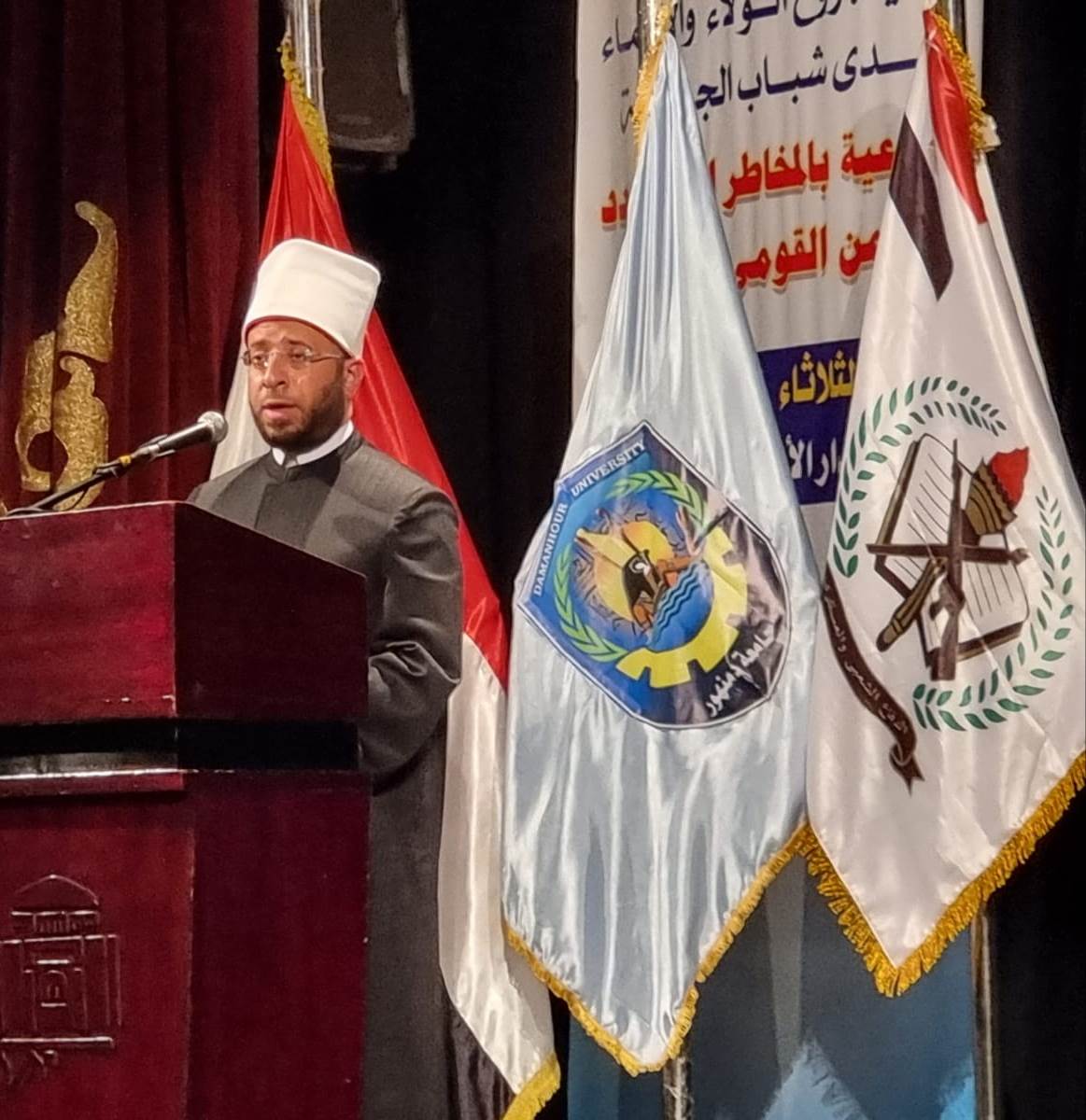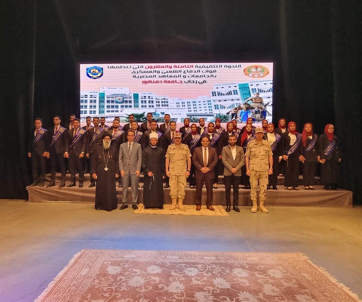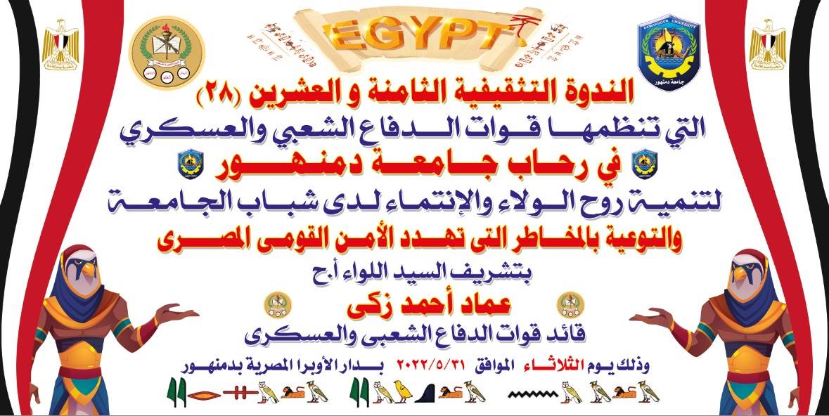 نظمت قيادة قوات الدفاع الشعبى والعسكرى الندوة التثقيفية الثامنة والعشرون التي تنظمها قوات الدفاع الشعبي والعسكري بالجامعات والمعاهد المصرية، فى رحاب جامعة دمنهور تحت رعاية الدكتور عبد الحميد السيد عبد الحميد نائب رئيس الجامعة للدراسات العليا والبحوث وبالتعاون مع إدارة التربية العسكرية والإدارة العامة لرعاية الطلاب بالجامعة لتوعية الشباب بالمخاطر التي تهدد الأمن القومي المصري وزيادة الوعي لجميع الأجيال القادمة، وذلك فى إطار حرص القيادة العامة للقوات المسلحة على تنمية روح الولاء والانتماء لشباب الجامعات.