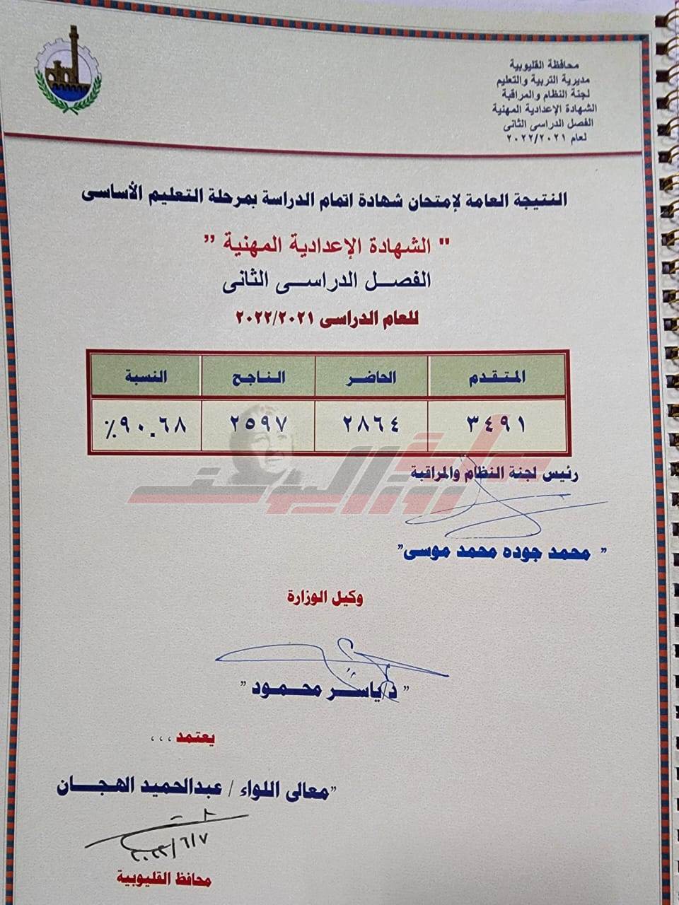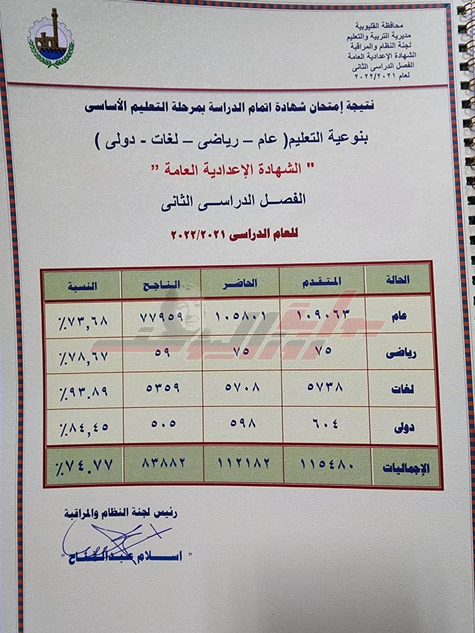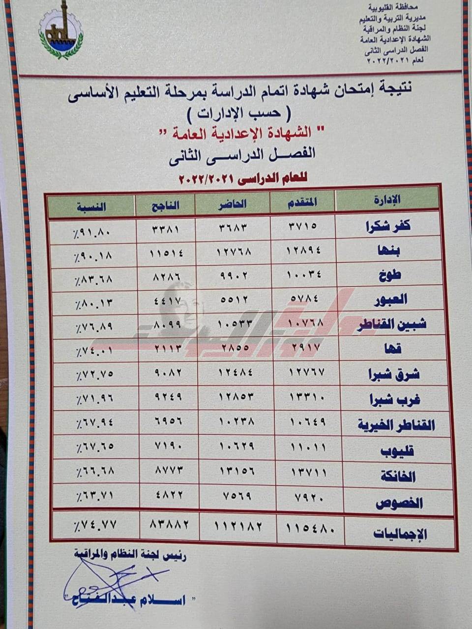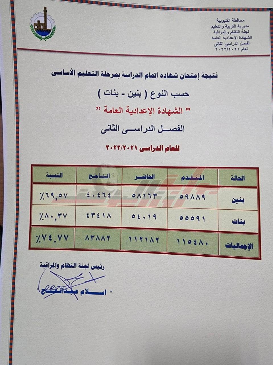 اعتمد اللواء عبد الحميد الهجان محافظ القليوبية، نتيجة امتحان الشهادة الاعدادية للعام الدراسي الحالي بنسبة 74.77 %، كما اعتمد نتيجة الاعدادية المهنية بنسبة 90.68 %، بحضور الدكتور ياسر محمود وكيل وزارة التربية والتعليم بالمحافظة واسلام عبد الفتاح رئيس كنترول الاعدادية