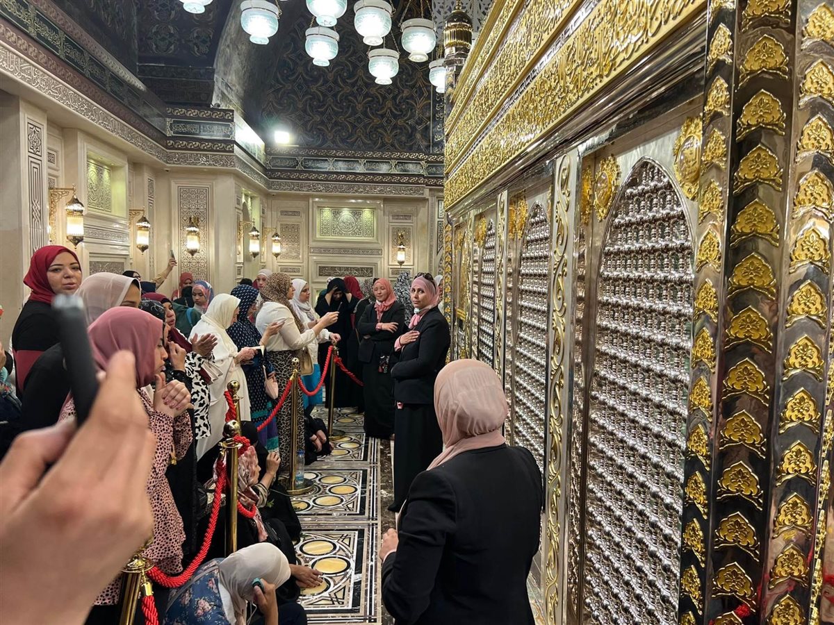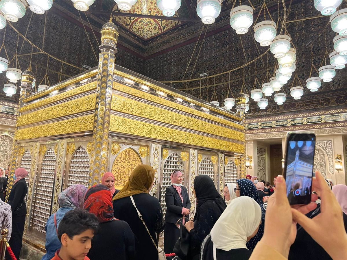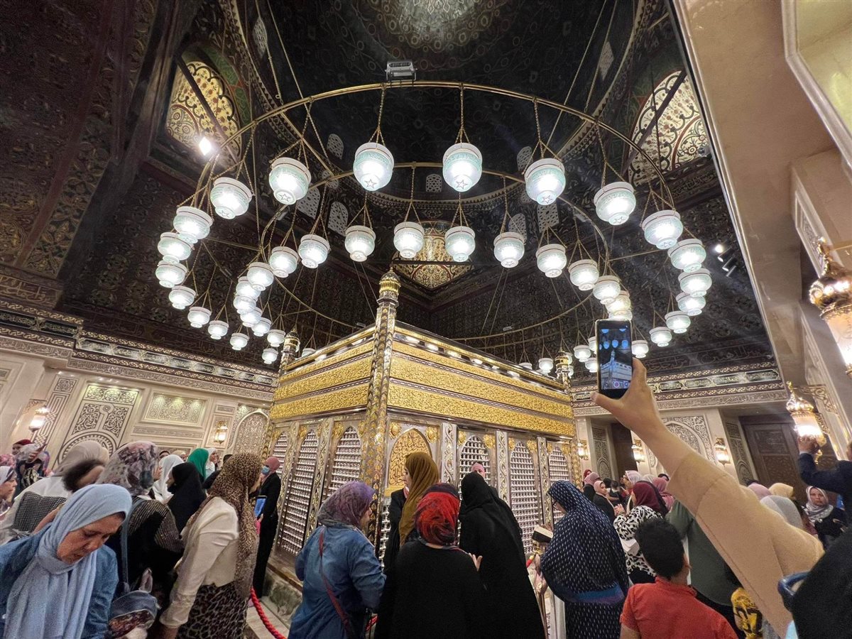 مشهد يحرص كل زوار الضريح على توثيقه من خلال التصوير "بالموبايلات" البسيط منها وغالي الثمن، حتى يعودوا لمنازلهم حاملين ذكرى المكان بصور وڤيديوهات مهما بلغت دقتها لن تُضاهي رؤيتك للمشهد بعينيك المجردة حين ترى نقوش السقف البديعة وامتزاج الألوان بها وحين تنزل عينيك لترى تفاصيل الضريح المزخرف بآياتٍ من القرآن الكريم، وحوله المُحبين من كل مكان.