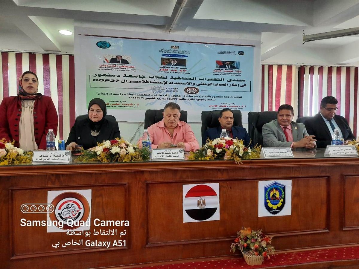 عقدت جامعه دمنهور بقيادة الدكتور عبد الحميد السيد عبد الحميد نائب رئيس جامعة دمنهور بالتعاون مع جهاز شؤون البيئة ومؤسسة الفريق التطوعي للعمل الإنساني منتدى "التغيرات المناخية لطلاب جامعة دمنهور" ضمن فعاليات مبادرة المليون شاب متطوع للتكيف المناخي "سفراء المناخ" برئاسة الدكتور محمد رفعت الامام عميد كلية الآداب جامعة دمنهور وإشراف وكيل كلية الآداب لشؤون تعليم الطلاب الدكتور ابراهيم مرجونة ووكيل الكلية لخدمة المجتمع الدكتور وفدى ابو النضر.