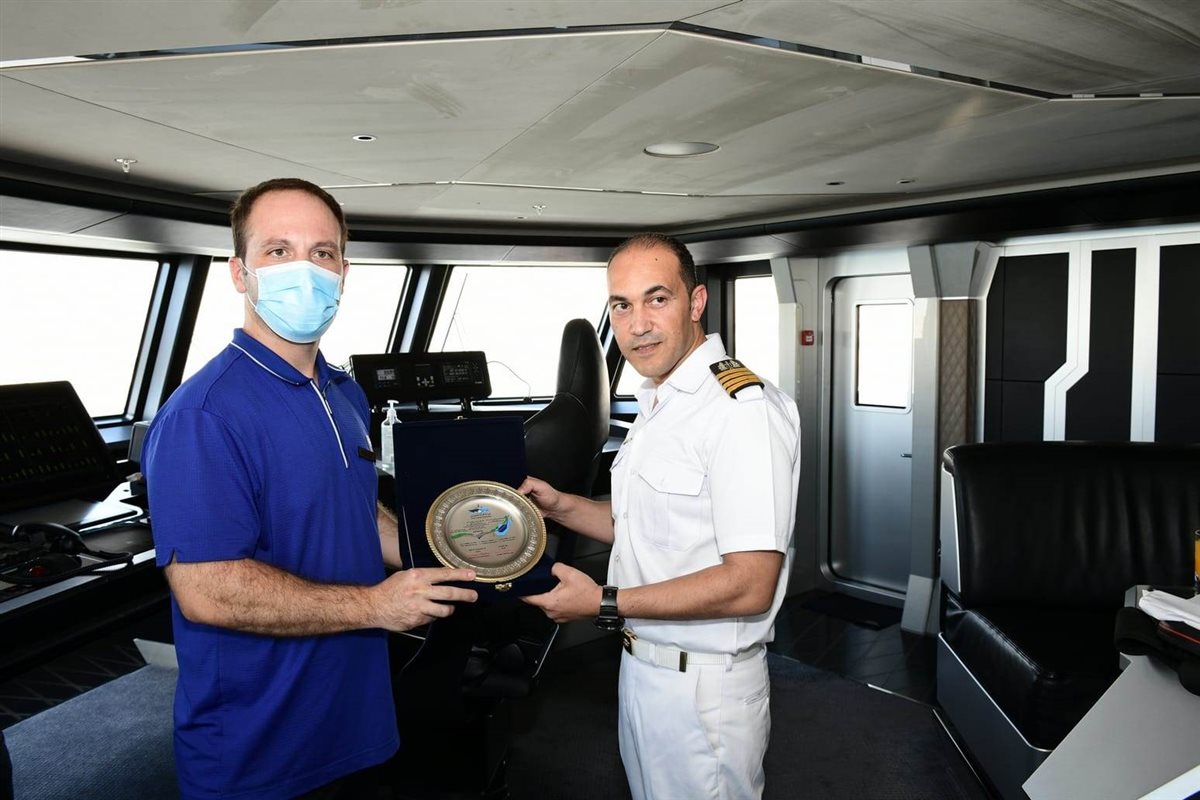 وفقا للبروتوكول المتبع من قبل الهيئة، وفي ضوء حرص الهيئة على تشجيع عبور السفن واليخوت السياحية والارتقاء بالخدمات المقدمة لهم، أناب الفريق أسامة ربيع رئيس هيئة قناة السويس القبطان شادي الصياد لتقديم درع الهيئة إلى قبطان اليخت كابتن Vasilis.