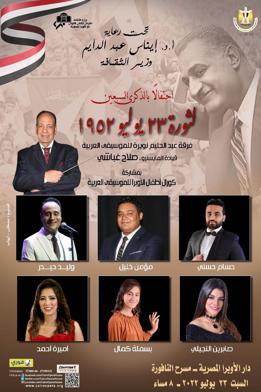 ضمن خطة وزارة الثقافة، وتحت رعاية الفنانة الدكتورة ايناس عبد الدايم وزيرة الثقافة تنظم دار الاوبرا المصرية برئاسة الدكتور مجدي صابر احتفالية وطنية بمناسبة الذكرى 70 لثورة 23 يوليو المجيدة ويحييها نجوم فرق الموسيقى العربية بمشاركة كورال اطفال الاوبرا تدريب سهير حسين وقيادة المايسترو صلاح غباشى وذلك في الثامنة مساء السبت 23 يوليو على مسرح النافورة.