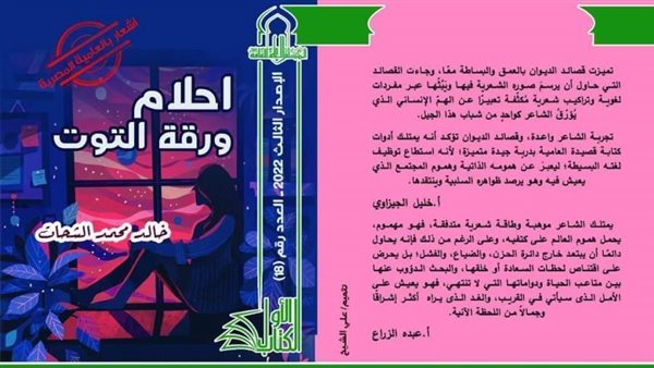 ضمن إصدارات وزارة الثقافة، وتحت رعاية الدكتورة إيناس عبدالدايم وزير الثقافة، صدر حديثًا عن المجلس الأعلى للثقافة، بأمانة الدكتور هشام عزمى، ضمن سلسلة الكتاب الأول التابعة للإدارة المركزية للشعب واللجان الثقافية، برئاسة الكاتب محمد عبد الحافظ ناصف، ديوان شعري جديد بعنوان "أحلام ورقة التوت"، للشاعر خالد محمد الشحات.