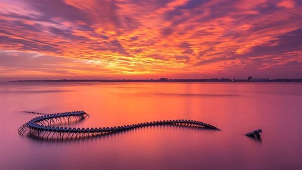 كوحش يبث الرعب في القلوب يزحف من الماء نحو اليابسة، ويتحين الوقت للانقضاض على فريسته، يرسو مجسم الهيكل العظمي الضخم لثعبان من عصور ما قبل التاريخ على شاطئ "سان بريفين ليه بينس" في فرنسا على حافة مصب نهر "لوار"، ويعد عملا فنيا رائعا كحفرية أثرية مخيفة تخرج من البحر، أبدعها الفنان الصيني الفرنسي هوانج يونج بينج.