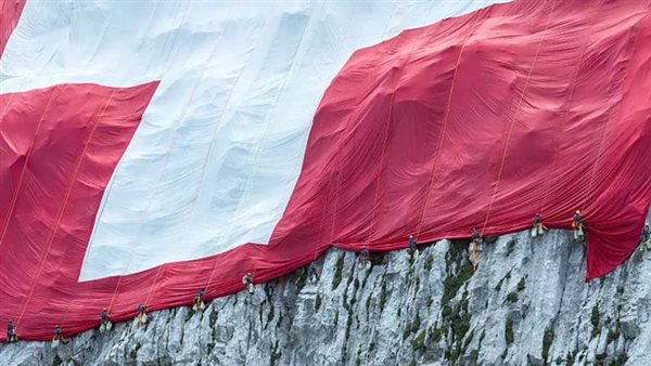 رفعت فرق من العمال أكبر علم سويسري في العالم على جرف بجبال الألب يوم الأحد للاحتفال بالعيد الوطني للبلاد في أول أغسطس- آب. وقالت شركة هيمغارتنر للأعلام إن العلم الذي تبلغ مساحته 6400 متر مربع يزن نحو 700 كيلوغرام واستغرق صنعه 600 ساعة.
