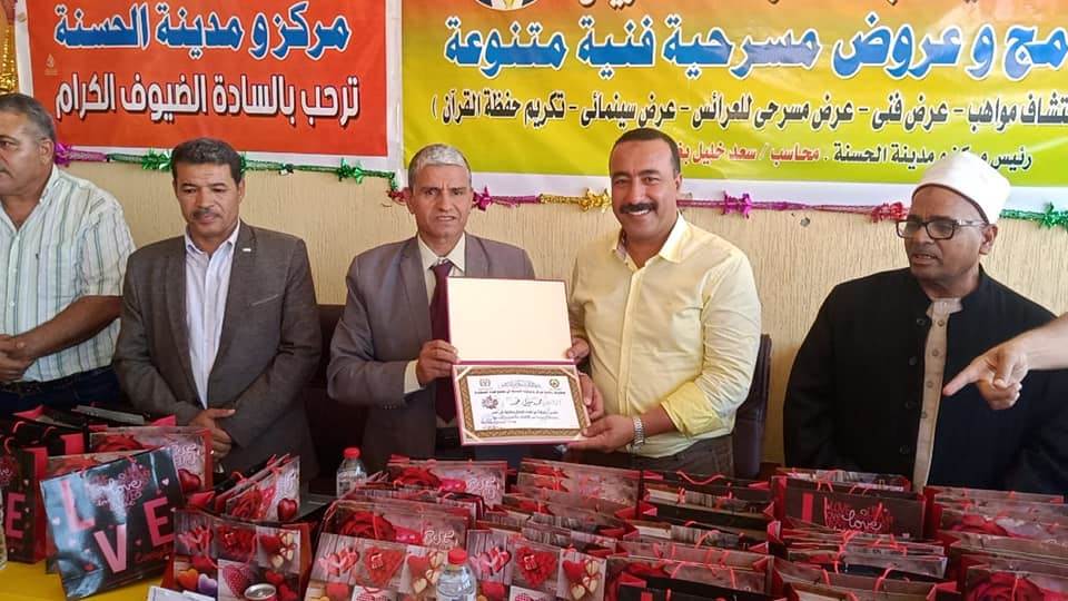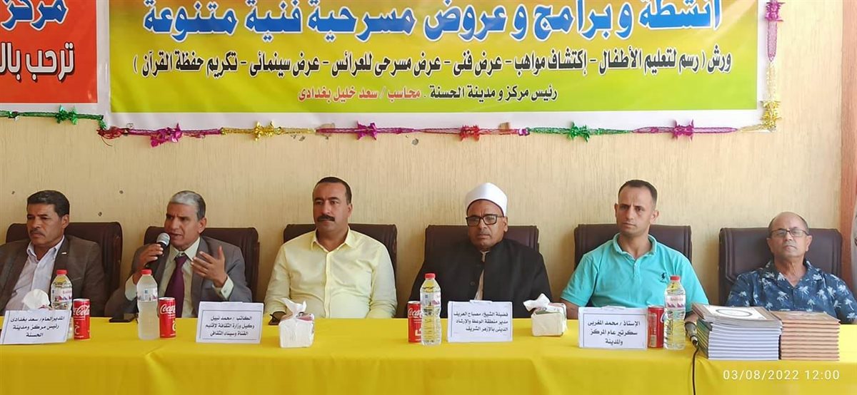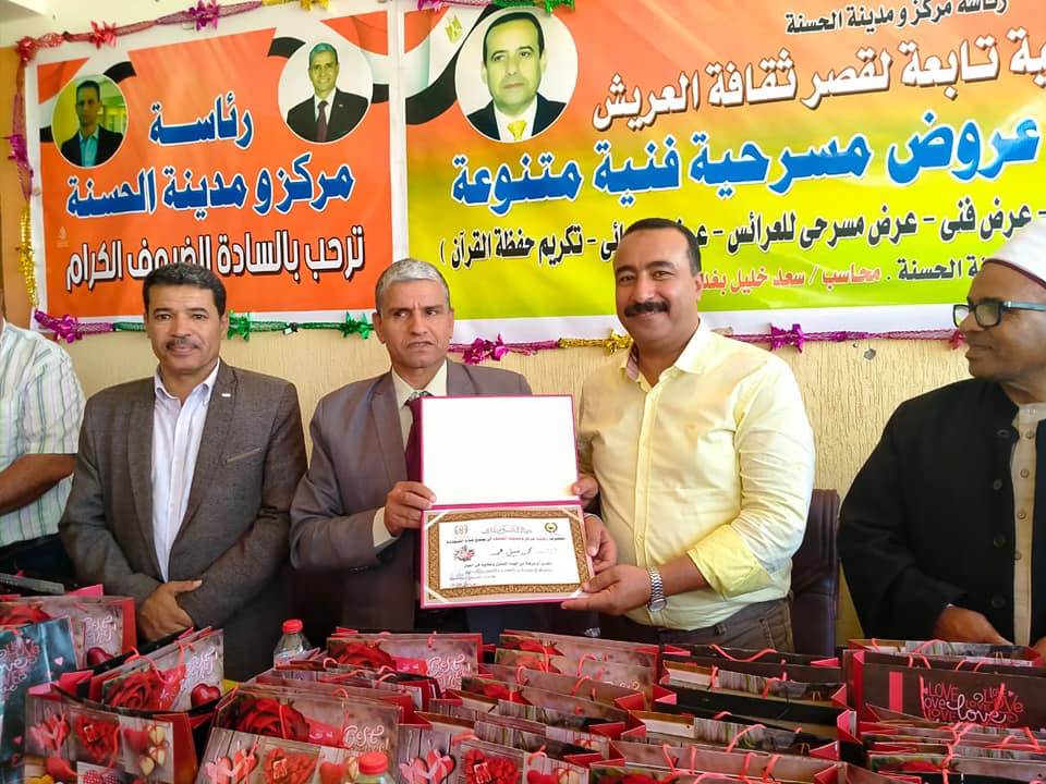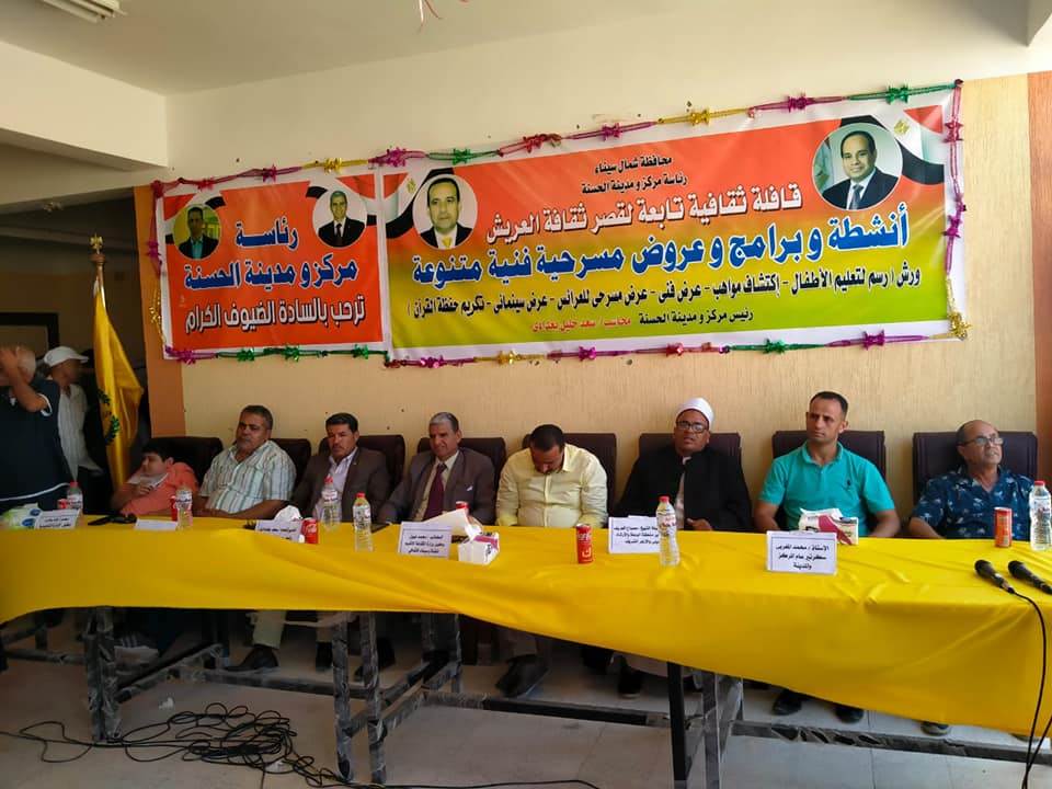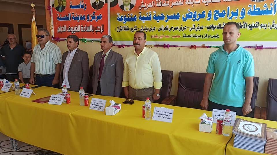 لليوم الثانى على التوالى.. واصلت قافلة الوديان الثقافية أنشطتها في مدينة الحسنة بوسط سيناء.. حيث تم تنفيذ البرنامج الثقافى للقافلة تحت رعاية الدكتورة إيناس عبد الدايم وزيرة الثقافة والدكتور محمد عبد الفضيل شوشة محافظ شمال سيناء، وبرئاسة الفنان هشام عطوة رئيس هيئة قصور الثقافة، والكاتب محمد نبيل رئيس الإدارة المركزية لاقليم القناة وسيناء الثقافى، وبحضور محمود حنفى وكيل فرع ثقافة شمال سيناء وبمشاركة الشيخ على السيد عبد الجليل من منطقة وعظ شمال سيناء.. حيث كان في استقبال القافلة المحاسب سعيد خليل البغدادى رئيس مركز ومدينة الحسنة.