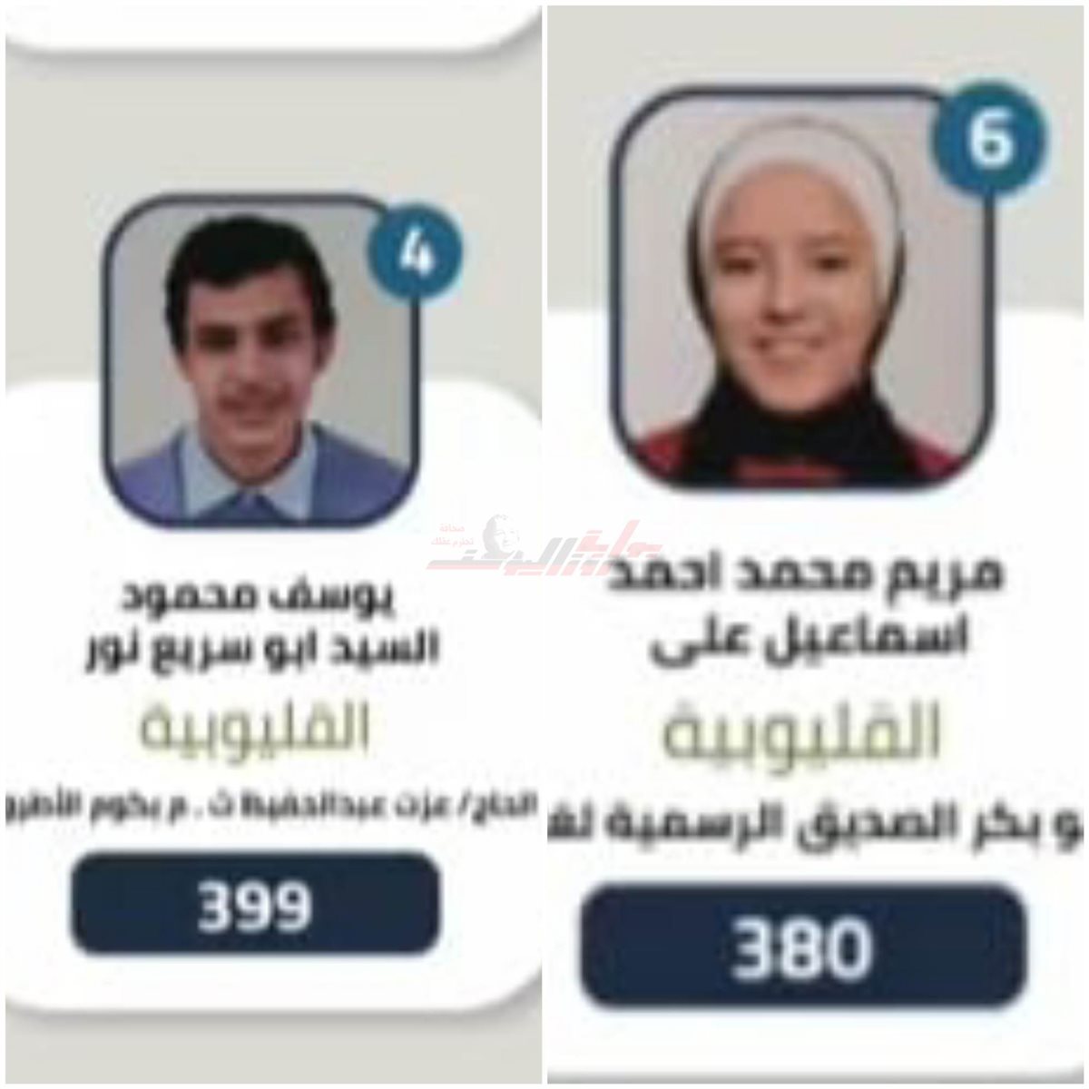 ووجه المحافظ رسالة شكر وتقدير للطالب " يوسف محمود السيد أبو سريع نور " ابن قرية كفر منصور بمركز طوخ، والحاصل علي المركز الرابع مكرر بالشعبة علمي علوم بمجموع ٣٩٩ درجه " والطالبة "مريم محمد أحمد إسماعيل " بمدرسة ابو بكر الصديق الرسمية لغات بالعبور لحصولهما على المركز السادس مكرر بالشعبة أدبى على مستوى الجمهورية بمجموع ٣٨٠ درجة.
