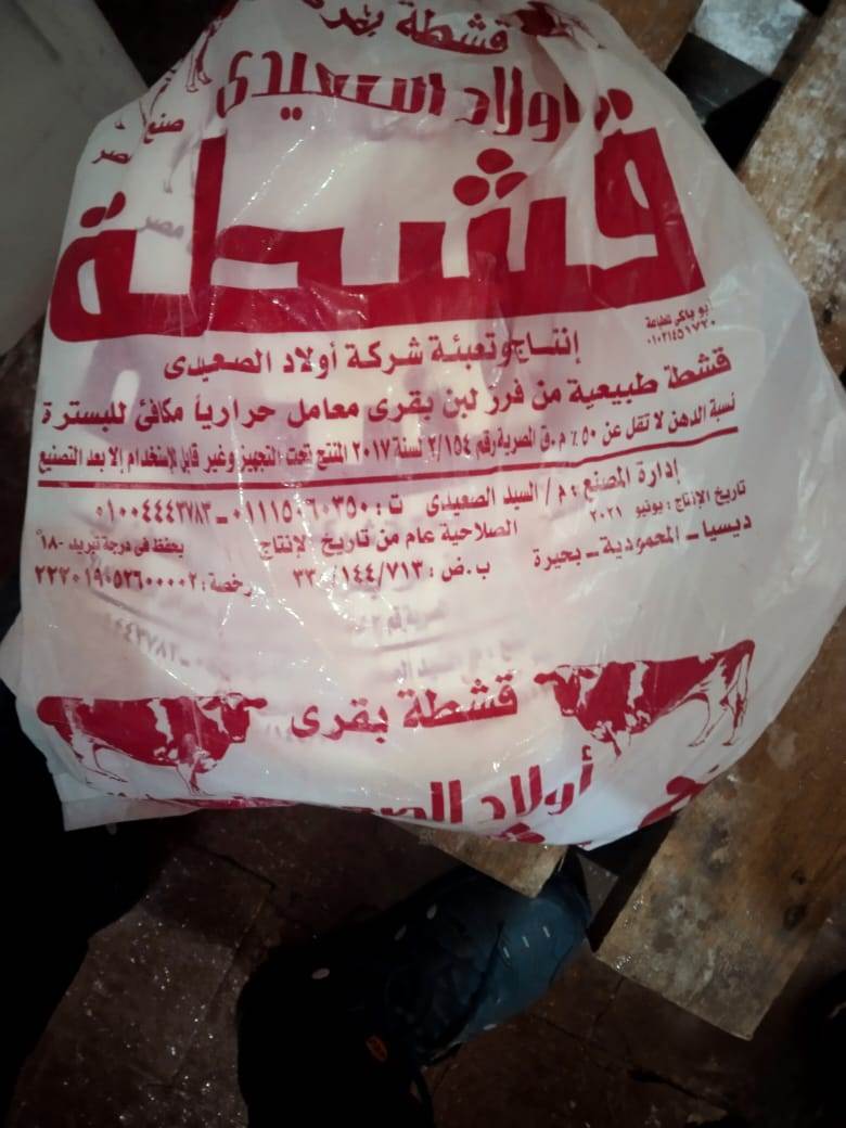 كما تم ضبط ٩ عبوات قشطة منتج نهائي مدون على العبوات تاريخ انتاج يونيو ٢٠٢١م الصلاحية لمدة عام أي أنها منتهية الصلاحية بإجمالى وزن ١٣٥ كيلوجراما، وتم التحفظ على المضبوطات واتخاذ الإجراءات القانونية اللازمة حيال المخالفين.