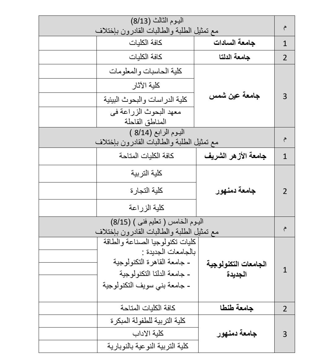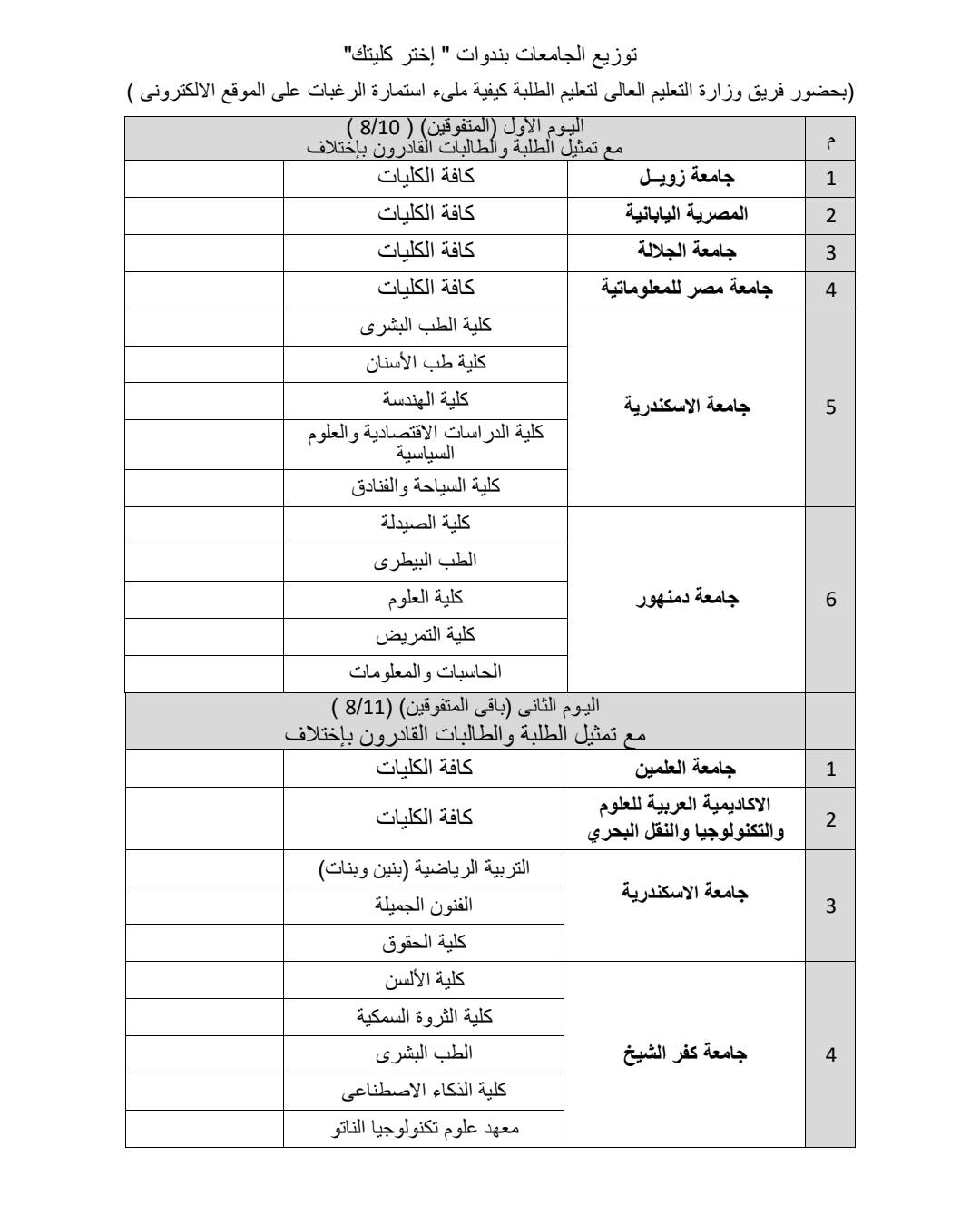 وتستهدف الندوات حضور 1200 طالب وطالبة، وأولياء أمورهم يوميا لمدة خمسة أيام متتالية وذلك بمشاركة جامعات "دمنهور، الإسكندرية، عين شمس، كفر الشيخ، السادات، الأزهر، العلمين، الجلالة، الدلتا، الأكاديمة العربية للعلوم والتكنولوجيا، الجامعات التكنولوجية، طنطا، مصر المعلوماتية، مدينة زويل، الجامعة المصرية اليابانية".