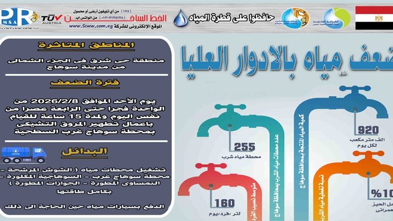 الأحد.. ضعف المياه بالأدوار العليا بمنطقة حى شرق بمدينة سوهاج لمدة 15 ساعة