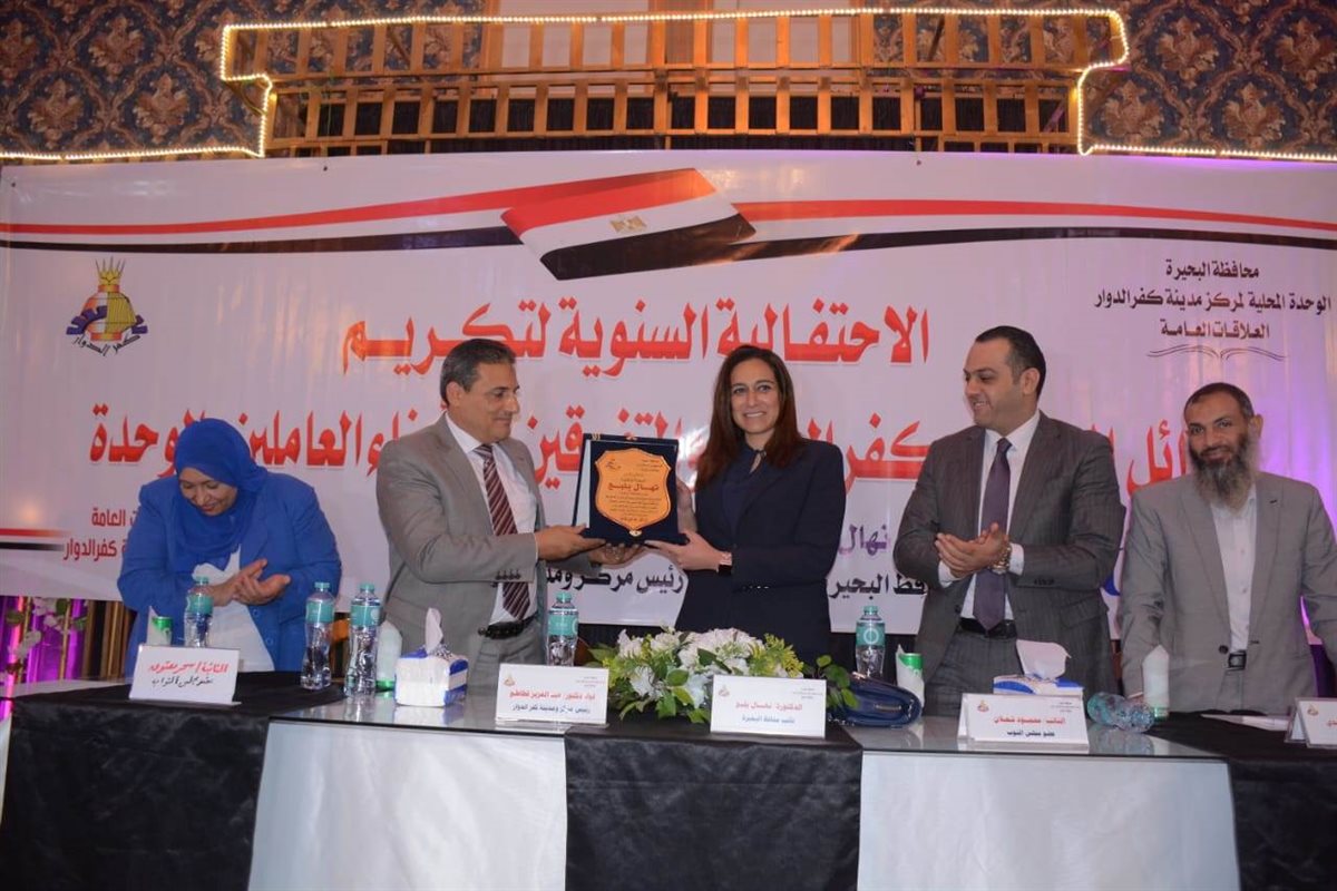 كما قام رئيس المدينة بإهداء درع الوحدة المحلية للدكتورة نهال بلبع نائب محافظ البحيرة تقديرًا لدعمها المستمر لمركز ومدينة كفر الدوار.