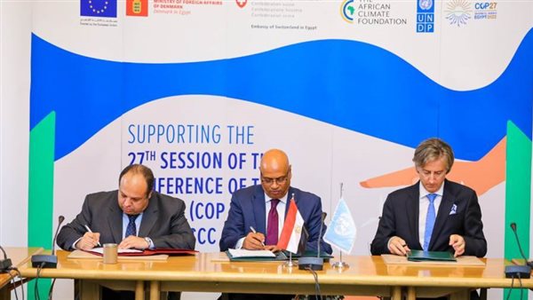 وقع برنامج الأمم المتحدة الإنمائي، والاتحاد الأوروبي، وسفارة الدنمارك، وسفارة سويسرا، والمؤسسة الإفريقية للمناخ، مشروعًا جديدًا بقيمة 6.2 مليون دولار لدعم رئاسة مصر للدورة السابعة والعشرون لمؤتمر الأطراف في اتفاقية الأمم المتحدة الإطارية بشأن تغير المناخ "COP27" التي ستعقد في شرم الشيخ في الفترة من ٦ إلى 18 نوفمبر من هذا العام.