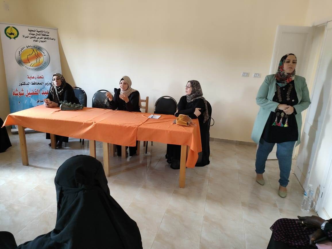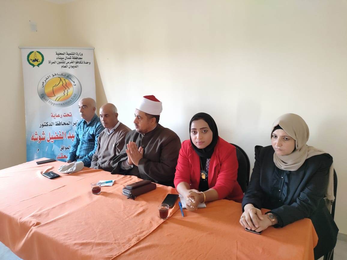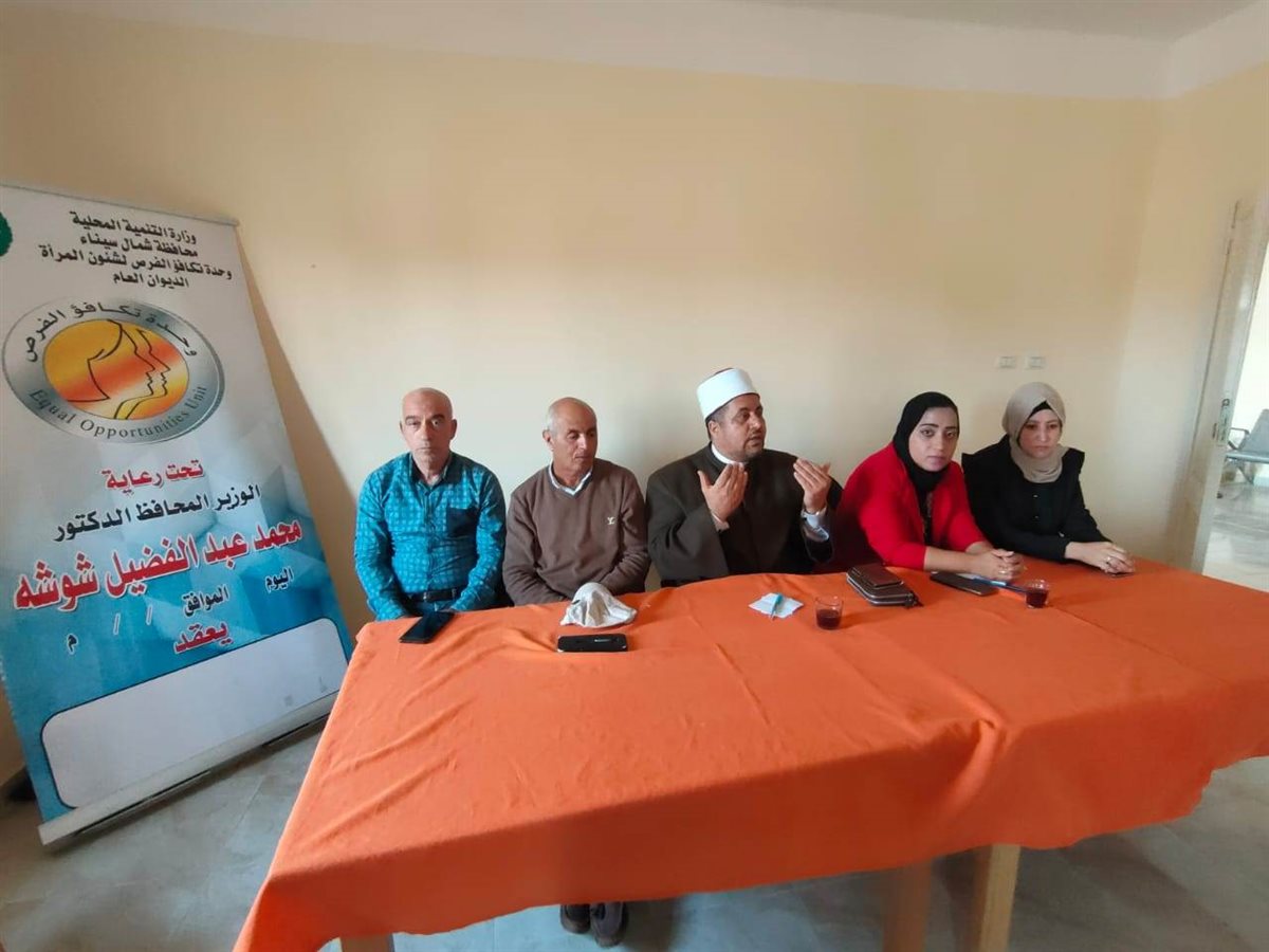 قامت وحدة تكافؤ الفرص بمحافظة شمال سيناء بالتنسيق مع منطقة وعظ شمال سيناء بعقد سلسه ندوات بقرية الروضة؛ حيث انطلقت أولى الندوات اليوم بحضور كل من الدكتورة هاجر صالح رئيس وحدة تكافؤ الفرص وتمكين المرأة بالمحافظة، منى على أبوبكر رئيس الوحدة العامة لحماية الطفل بالمحافظة، ورئيستا الوحدة الفرعية لتكافؤ الفرص والوحدة الفرعية للطفل بمركز ومدينة العريش.