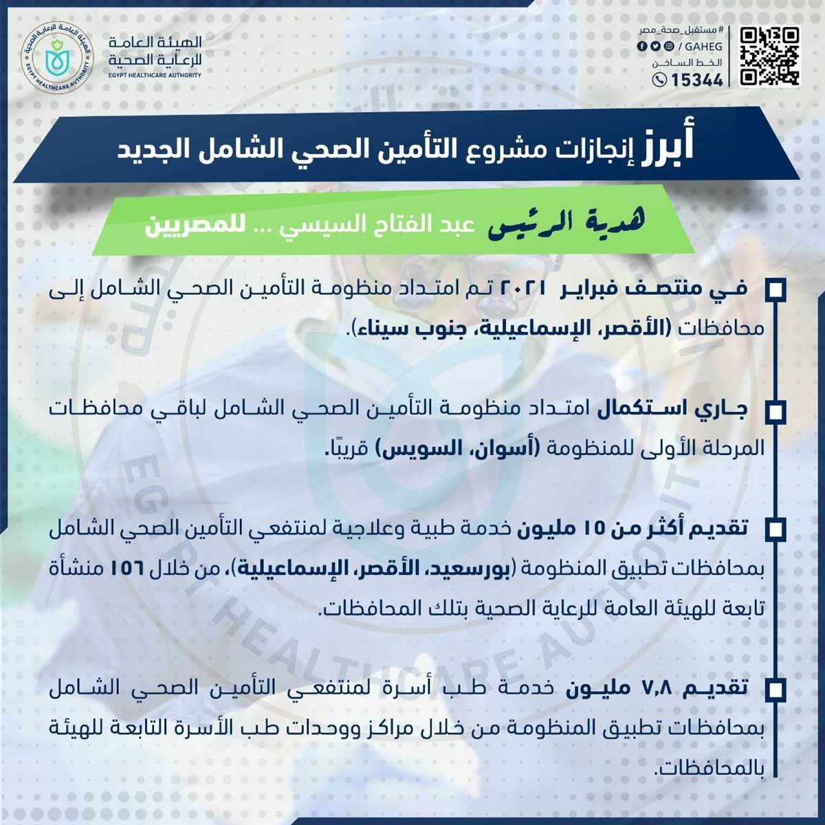 ▪️تقديم 15 مليون خدمة طبية وعلاجية من خلال 156 منشأة طبية تابعة للهيئة العامة للرعاية الصحية بالمحافظات الثلاث لمنظومة التأمين الصحي الشامل (بورسعيد، الأقصر، الإسماعيلية).