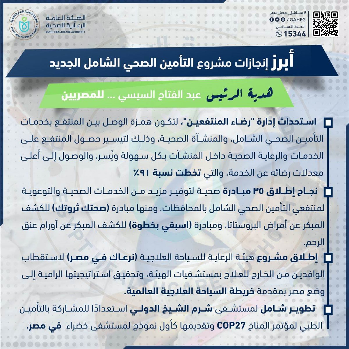 ▪️إطلاق مشروع هيئة الرعاية الصحية للسياحة العلاجية تحت شعار (نرعاك في مصر) لاستقطاب الوافدين الأجانب وعلاجهم بمستشفيات الهيئة بالمحافظات، وتحقيق استراتيجية الهيئة الرامية لوضع مصر بمقدمة خريطة السياحة العلاجية العالمية.