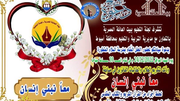 فى إطار اهتمام الدولة بمصر الجديدة والتأكيد على مبدأ الوحدة الوطنية وتنمية روح الولاء للوطن، تكرم غدا السبت لجنة التعليم ببيت العائلة المصرية بالتعاون مع مدارس السلام المتطورة سنودس النيل الإنجيلى وتحت مظلة الأزهر الشريف والكنيسة المصريه و تحت رعاية اللواء عصام سعد محافظ أسيوط والشيخ سيد عبدالعزيز الأمين العام لبيت العائلة المصرية لمحافظة اسيوط الطلاب الفائزين فى مبادرة معا لحفظ آيات القرآن الكريم وأيات من الكتاب المقدس لمرحلة التعليم الابتدائية والاعدادية والثانوية.