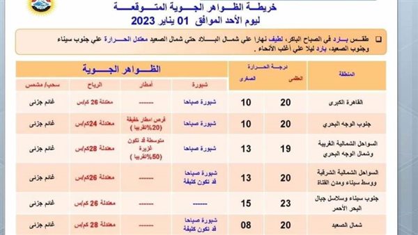 "الأرصاد" الجوية المصرية أصدرت منذ قليل تنويهًا عن أحوال الطقس لأول أيام العام الجديد ٢٠٢٣، غدًا الأحد، ويتضمن التنويه خريطة الظواهر الجوية المتوقعة غدًا الأحد، محذرة من سقوط أمطار متوسطة قد تكون غزيرة على السواحل الشمالية الغربية وشمال الوجه البحرى.