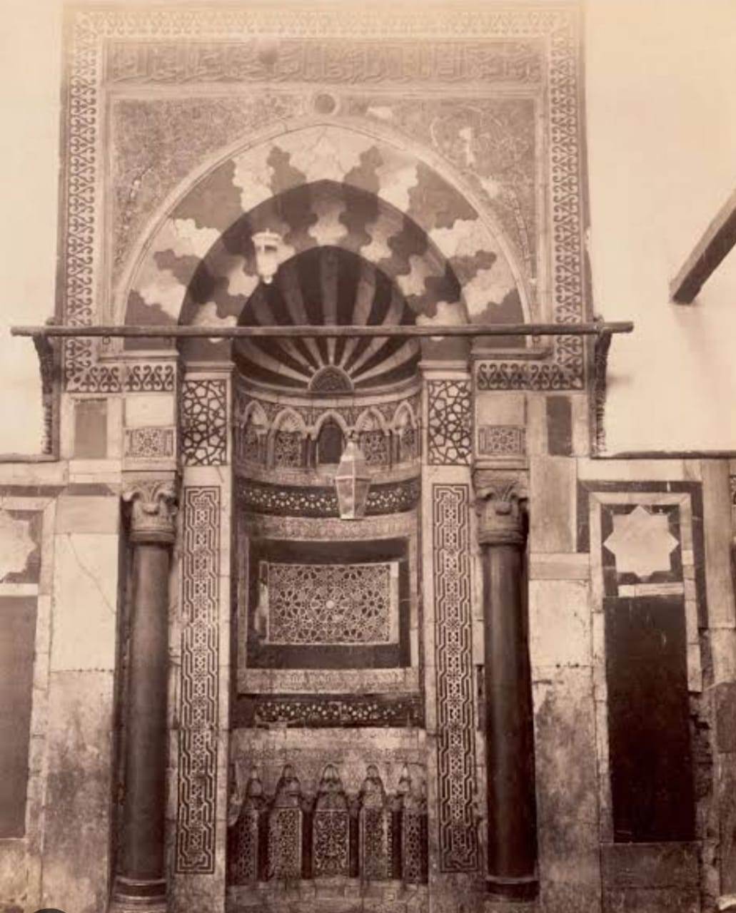 وتابع: ويعلو مقدمة هذا المجاز من عند الصحن، قبة محمولة على أعمدة وأكتاف، وعقود هذا المجاز تعتبر أقدم عقود في هذا الرواق، وعقود المجاز وسقفه مرتفع عن باقي الرواق، وقد حليت عقوده وواجهاتها بنقوش نباتيه جميلة وكتابات كوفيه مزهوة، وبأعلى الجدار الأصلي للجامع توجد شبابيك القديمة منها ذات، عقود مستديرة، وهي جصية ومفرغة بأشكال هندسية تتخللها مضاهيات ملونة، ويحيط بهذه النوافز أفريز من الخط الكوفي المزخرف بآيات من القرآن الكريم، وما زالت بقايا هذه الشبابيك تحدد الجامع القديم من جهاته الثلاث الشرقية والقبلية والبحرية.
