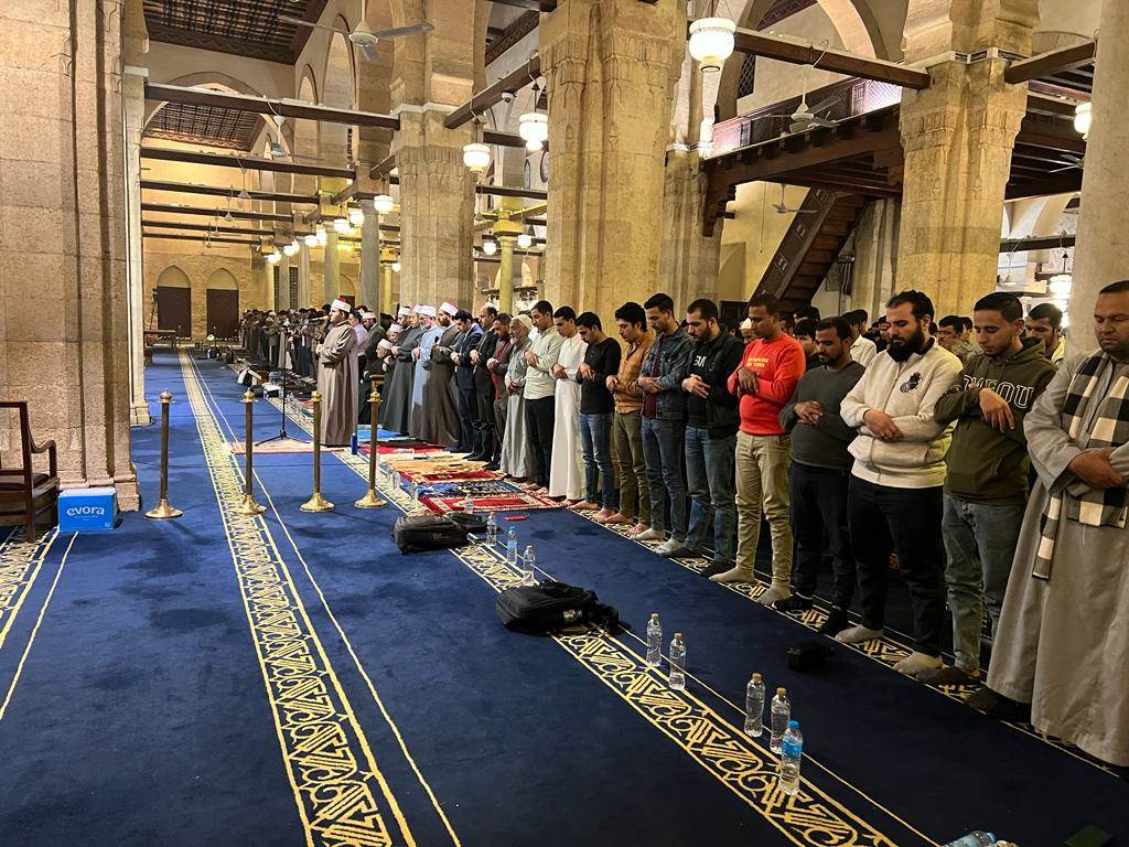 وتقدم المصلون فضيلة الشيخ أيمن عبد الغني، رئيس قطاع المعاهد الأزهرية، والدكتور عبد المنعم فؤاد، المشرف العام على الأروقة العلمية للرواق الأزهري، والدكتور عبد الكريم إبراهيم صالح، رئيس لجنة مراجعة المصحف الشريف، والشيخ حسن عبد النبي، وكيل لجنة مراجعة المصحف، والشيخ سلامة كامل جمعة، عضو لجنة مراجعة المصحف، والدكتور أبو اليزيد سلامة، مدير عام شؤون القرآن الكريم بالأزهر، والدكتور هاني عودة، مدير عام الجامع الأزهر، ونخبة من علماء وقيادات الأزهر، وأقيمت صلاة العشاء من سورة الحجر برواية حفص عن عاصم، وأقيمت صلاة التراويح من سورة النحل برواية ورش عن نافع المدني، ورواية الدوري عن الإمام الكسائي، ورواية رويس عن يعقوب الحضرمي.