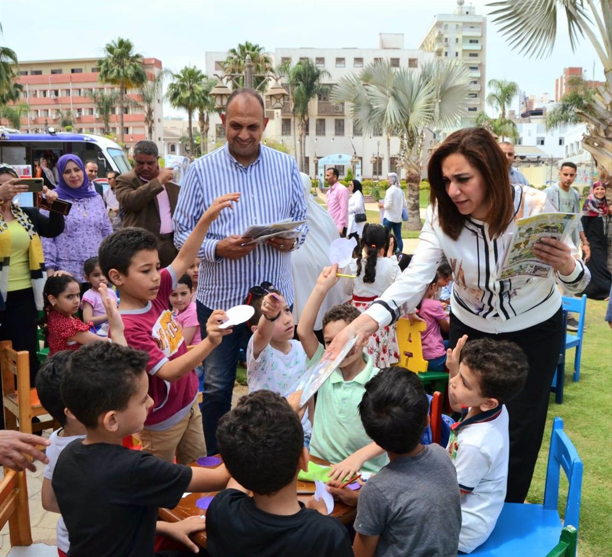كما تفقدت سيارة التبرع بالدم وأنشطة المكتبة المتنقلة و متابعة تنفيذ أنشطة وورش العمل والتلوين والرسم للاطفال للتوعية بأضرار ومخاطر التدخين وقامت بتوزيع الهدايا التذكارية عليهم تشجيعا لهم.