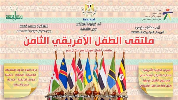 ضمن خطة نشاط وزارة الثقافة، وتحت رعاية الدكتورة نيفين الكيلاني وزيرة الثقافة، وإشراف الدكتور هشام عزمي أمين عام المجلس الأعلى للثقافة، يحتفل المركز القومى لثقافة الطفل برئاسة الكاتب محمد ناصف باليوم العالمي للطفل الإفريقي للعام الثامن على التوالي اليوم الأحد، بالحديقة الثقافية بالسيدة زينب بإدارة الباحثة ولاء محمد في تمام الساعة الخامسة مساء، بهدف تدعيم التواصل بين أطفال قارة إفريقيا ودعم الترابط والتمسك بالهوية الإفريقية، وذلك بالتعاون مع وزارة الخارجية وقطاع العلاقات الثقافية الخارجية برئاسة الدكتورة إيمان نجم وبمشاركة عدد من السفارات العربية والإفريقية، منها "السنغال- الجزائر- المغرب- تونس- ليبيا- موريتانيا- بورندي- تنزانيا- كينيا- أوغندا- جيبوتي- المغرب- روندا"، ويتضمن الملتقى مجموعة متنوعة من الأنشطة والورش الفنية منها: