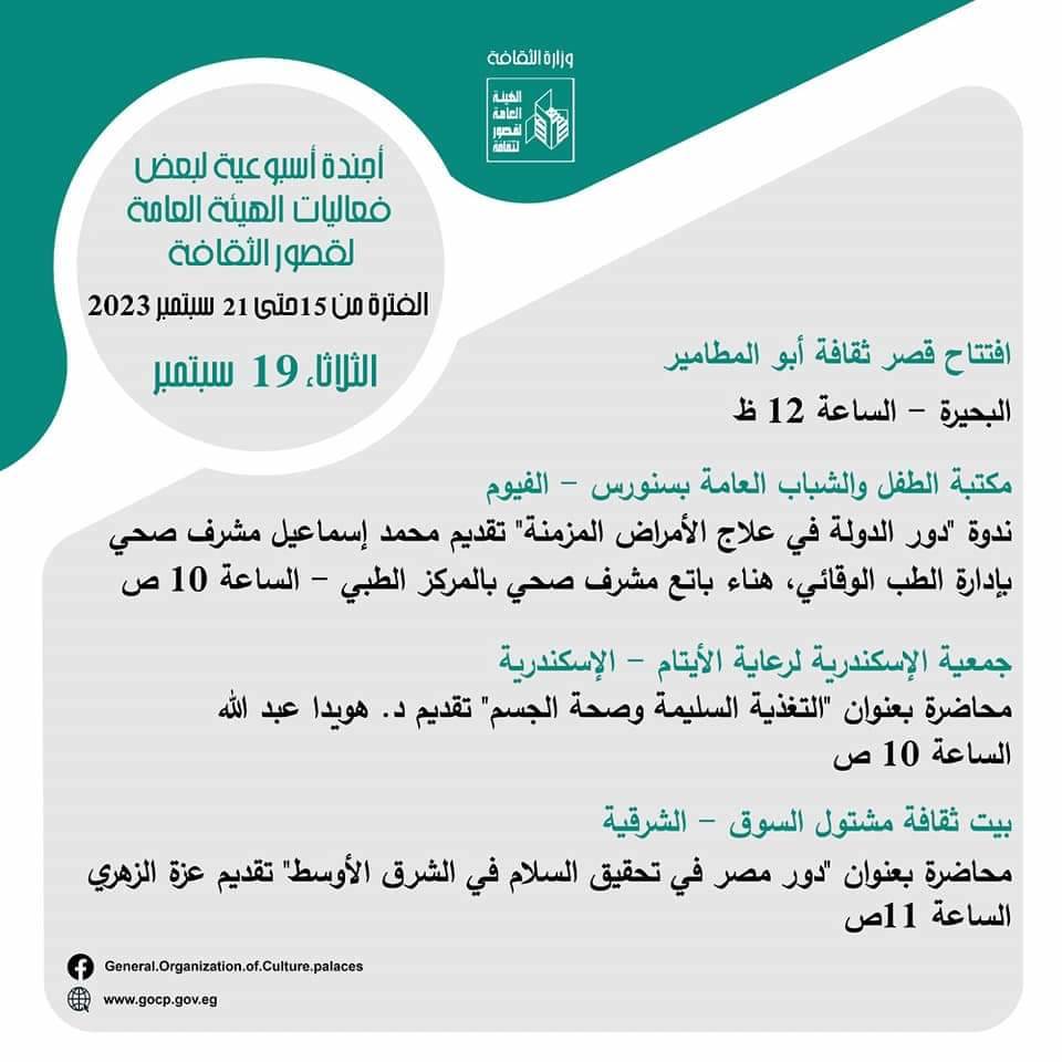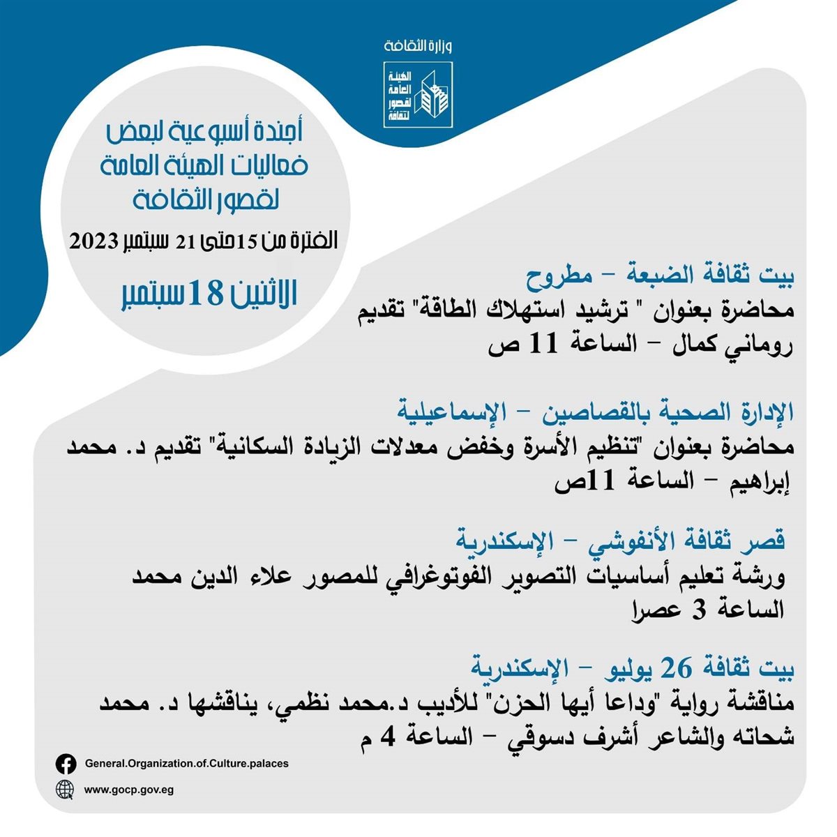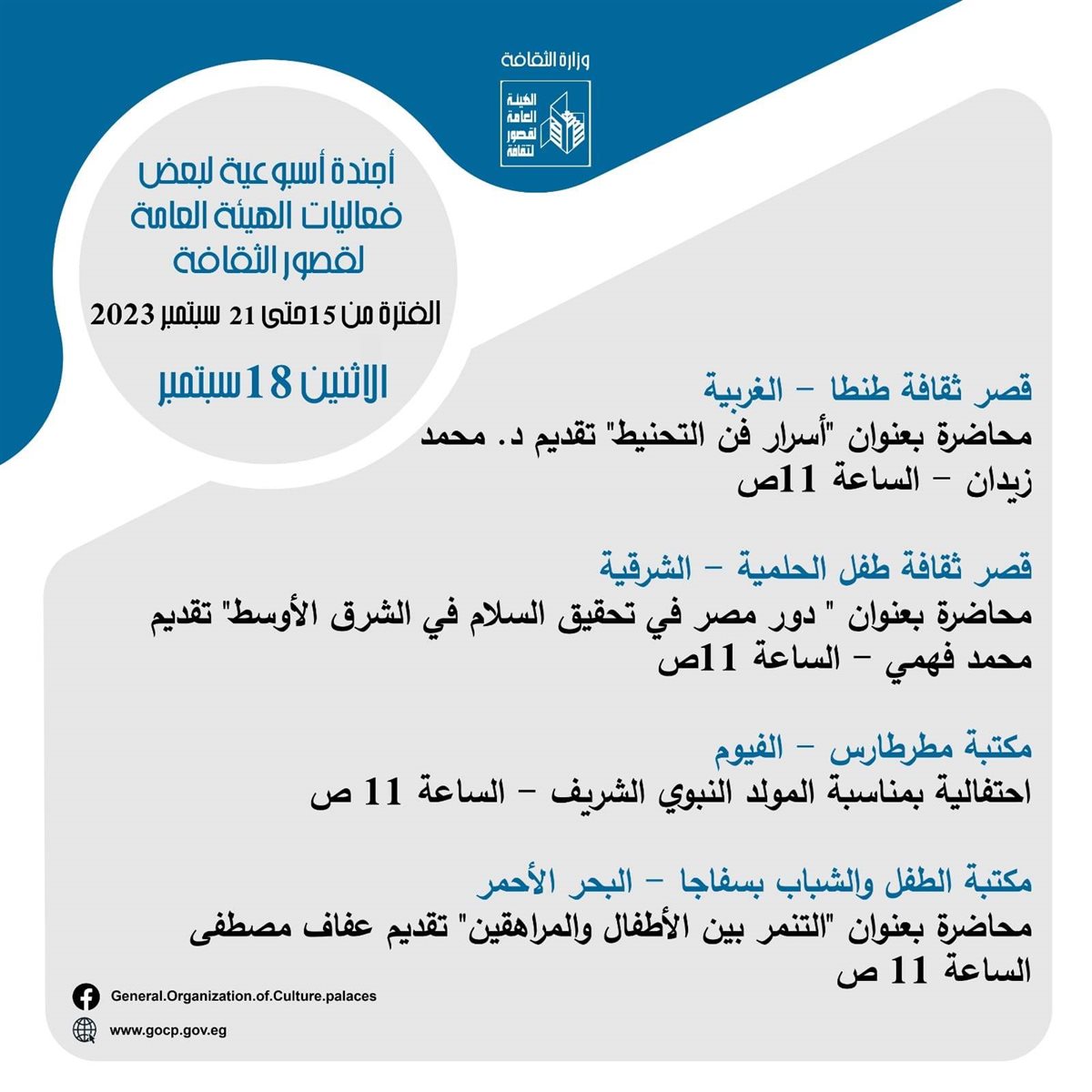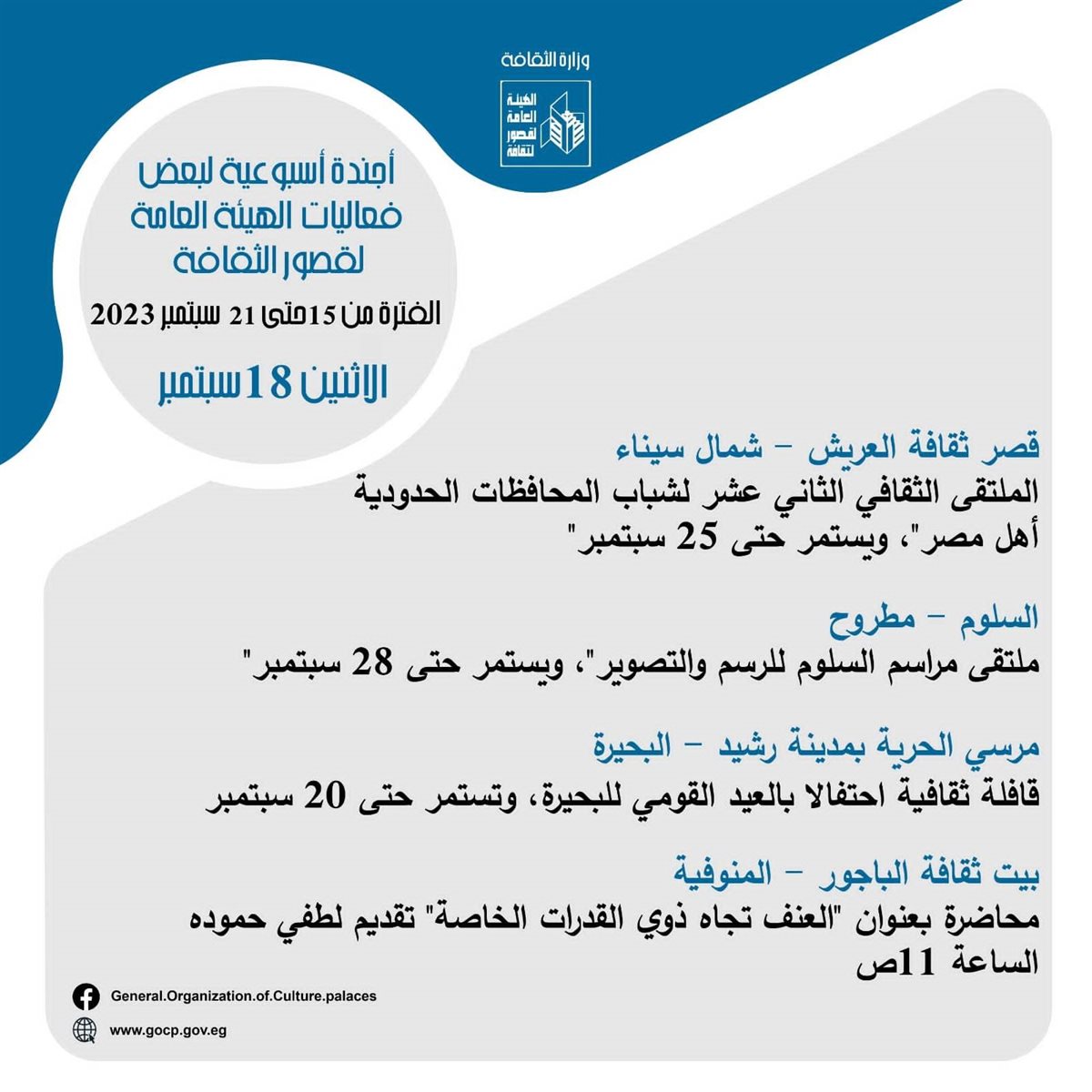 ومن البحيرة إلى مطروح يستعد قصر ثقافة مرسى مطروح لاستقبال ملتقى مراسم السلوم للرسم والتصوير يوم 18 سبتمبر وتستمر فعالياته حتى نهاية الشهر الحالي، وفي اليوم ذاته يشهد قصر ثقافة العريش الملتقى الثاني عشر لشباب المحافظات الحدودية ضمن مشروع "أهل مصر" ويستمر حتى 25 سبتمبر.